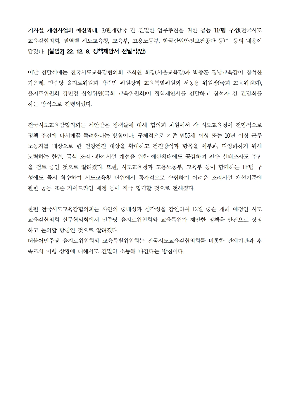 [보도자료] 을지로위원회·교육특별위원회, 전국시도교육감협의회 간 학교 급식노동자 폐암 관련 현안 정책제안서 전달식 열려