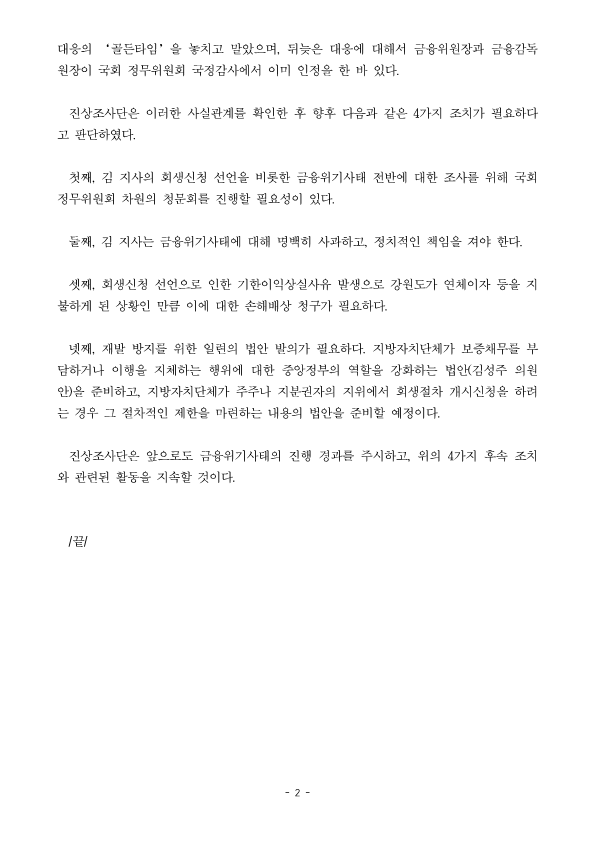 [보도자료] 더불어민주당 김진태발 금융위기사태 진상조사단, "금융위기의 책임자는 김 지사와 금융당국"