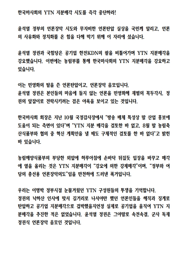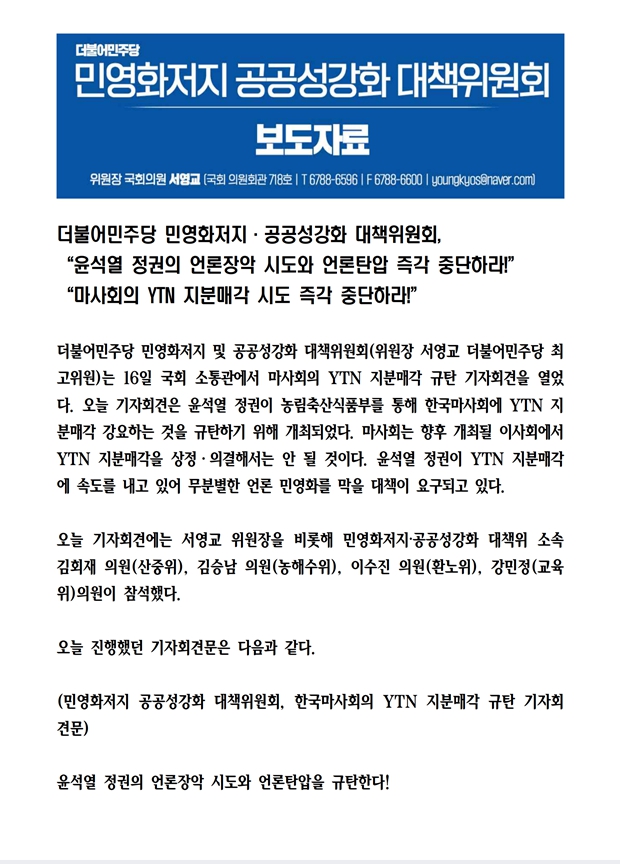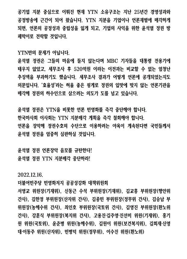 [성명서] 더불어민주당 언론자유대책특별위원회, 공기업 팔 비틀어 졸속 추진하는 YTN 지분 매각 중단하라
