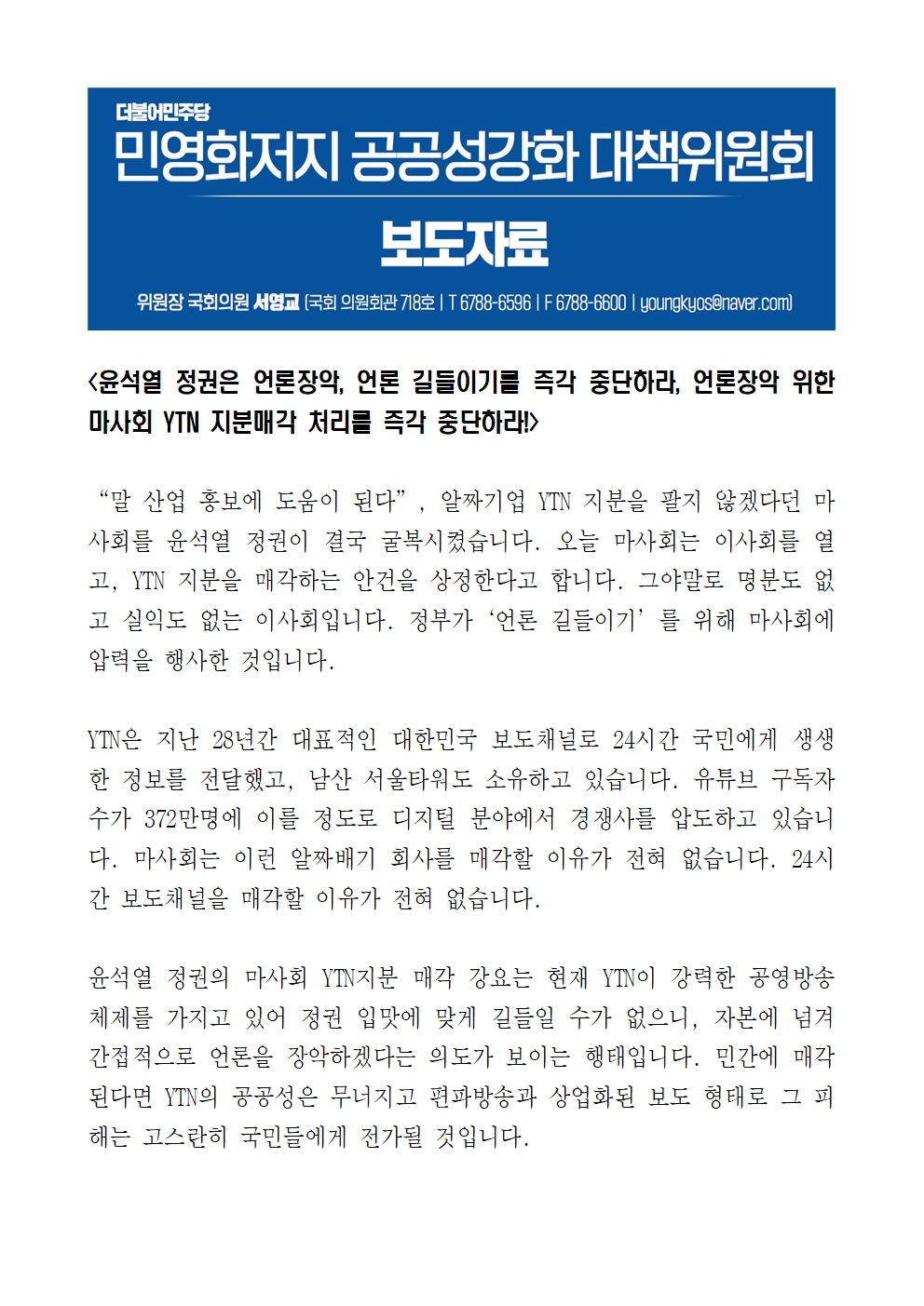 [보도자료] 민영화저지·공공성강화 대책위원회, 윤석열 정권은 언론장악·언론 길들이기를 즉각 중단하라, 언론장악 위한 마사회 YTN 지분매각 처리를 즉각 중단하라