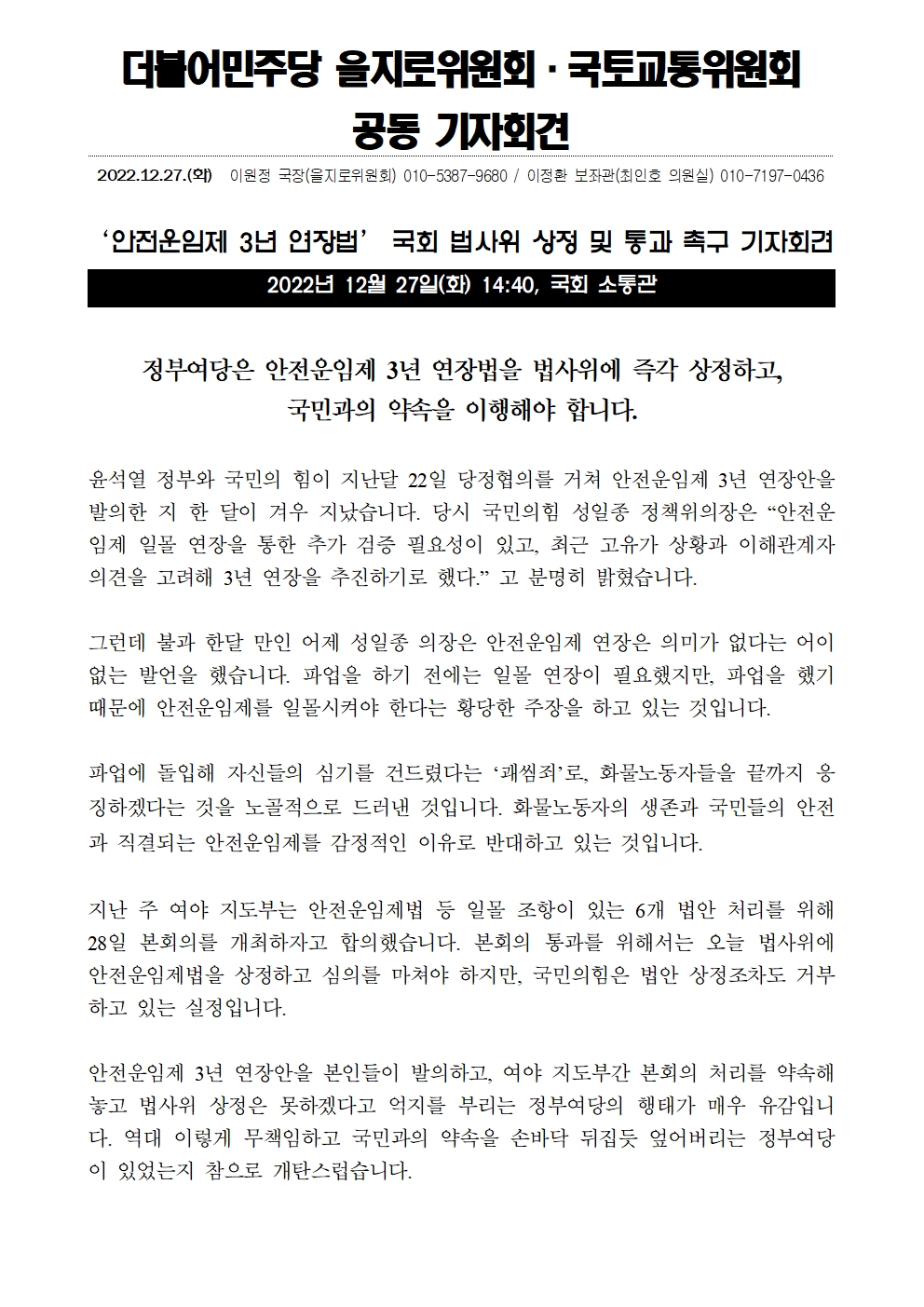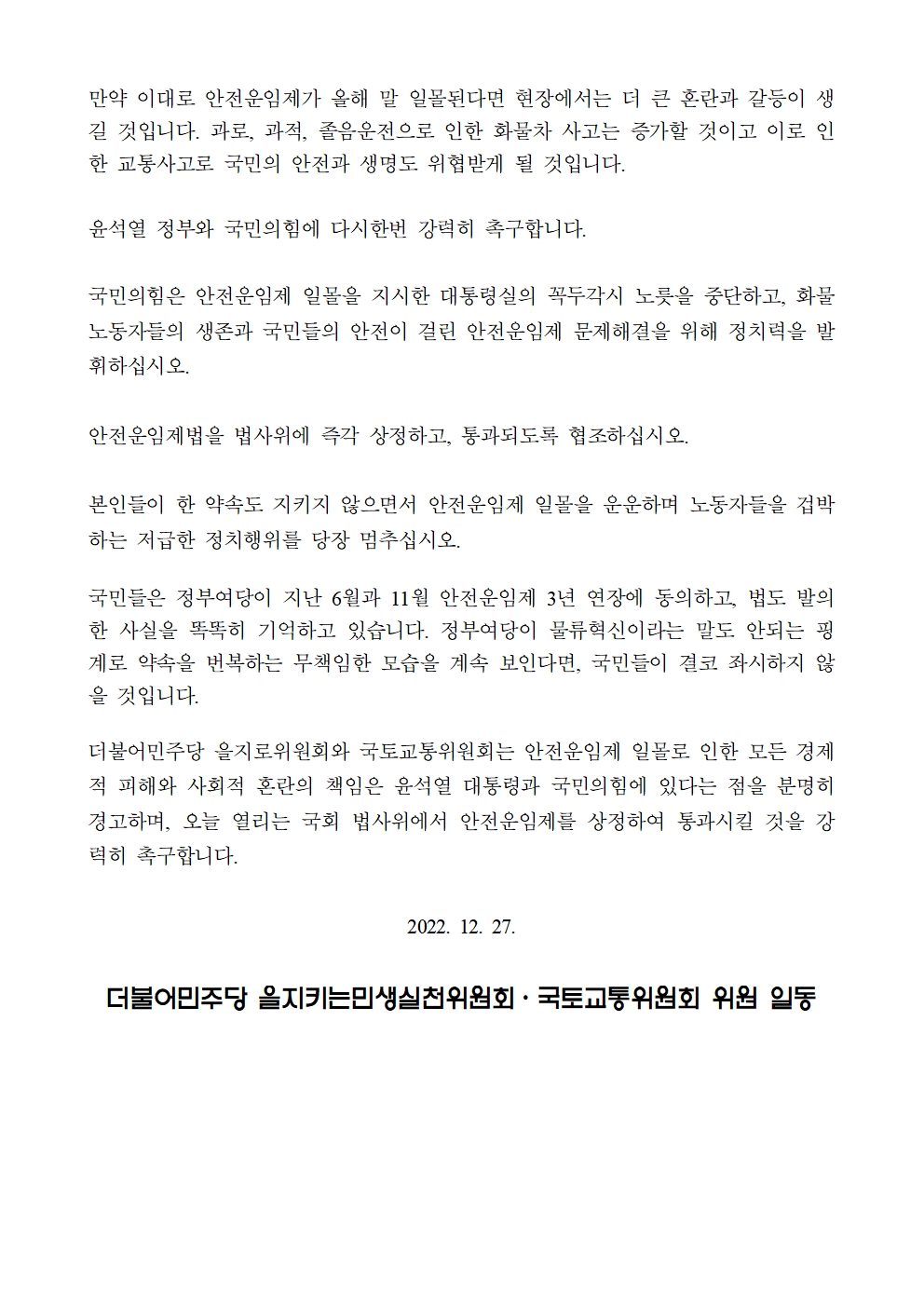 [기자회견문] 더불어민주당 을지로위원회·국토교통위원회, 정부여당은 안전운임제 3년 연장법을 법사위에 즉각 상정하고, 국민과의 약속을 이행해야 합니다