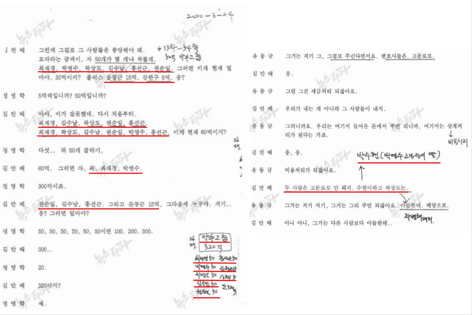 녹취록 속 대장동 일당들에게 박영수 전 특검을 대를 이어 챙겨야할 중요한 인물로 묘사됩니다. 2020년 10월 30일 정영학 녹취록에서 김만배는 “두 사람은 고문료로 안 되지. 수현이(박영수 전 특검 딸)하고 곽상도는”이라고 말합니다.