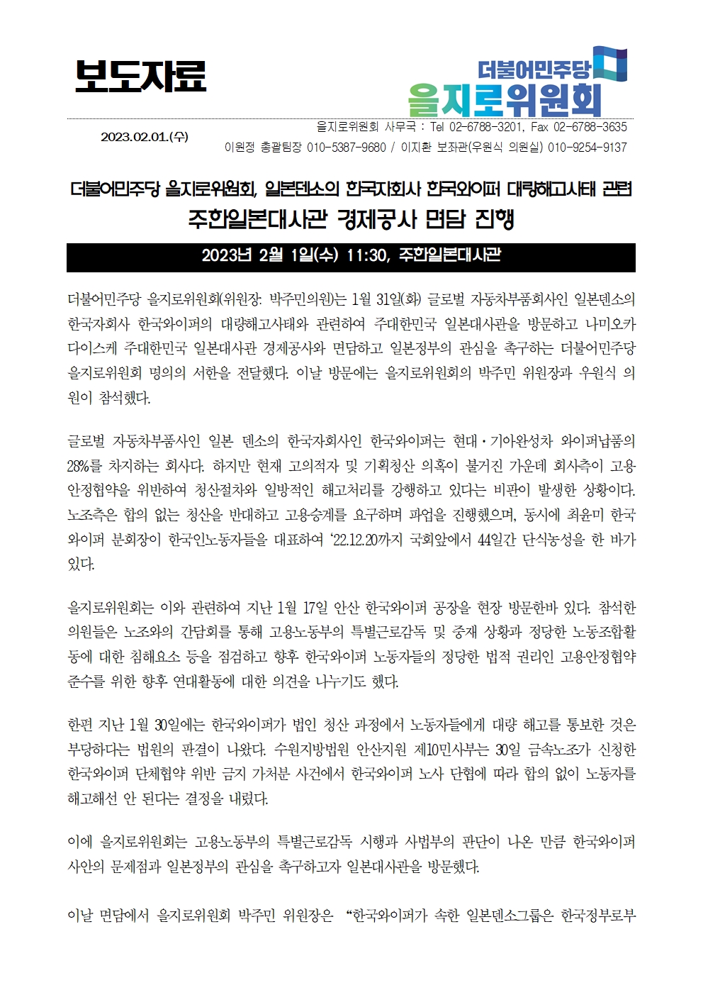 [보도자료] 더불어민주당 을지로위원회, 일본덴소의 한국자회사 한국와이퍼 대량해고사태 관련 주한일본대사관 경제공사 면담 진행