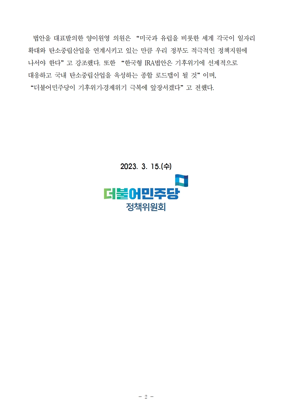 [보도자료] 더불어민주당 정책위원회, 탄소중립산업에 대한 투자세액공제와 국가탄소중립기술개발 사업 추진 등을 담은 ‘한국형 IRA’ 법안 발의