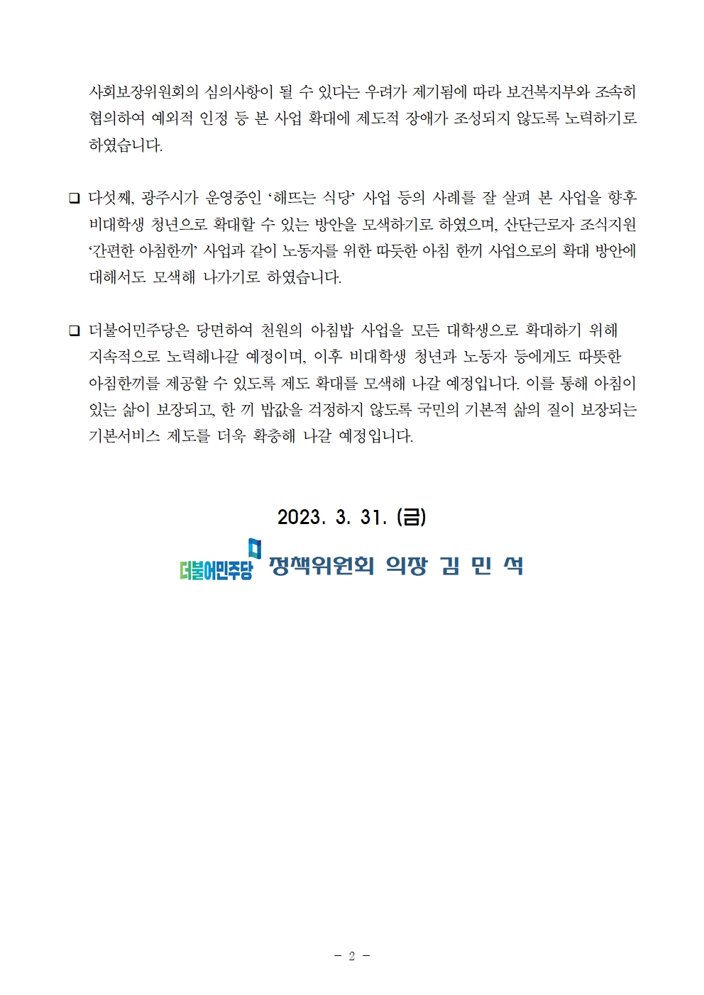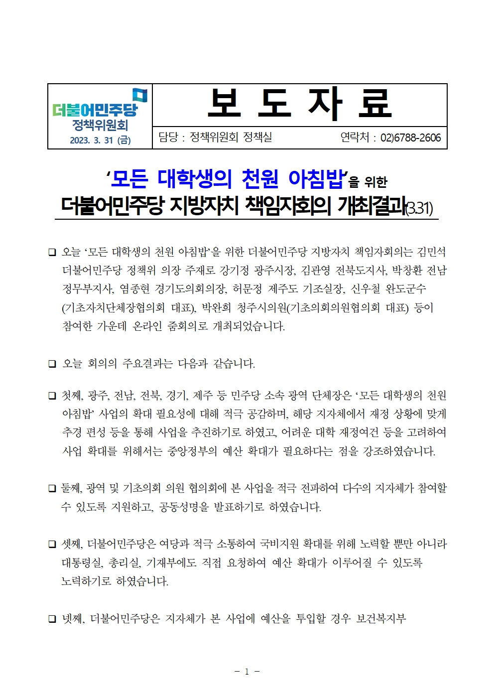 [보도자료] 더불어민주당 정책위원회, ‘모든 대학생의 천원 아침밥’을 위한 더불어민주당 지방자치 책임자회의 개최결과