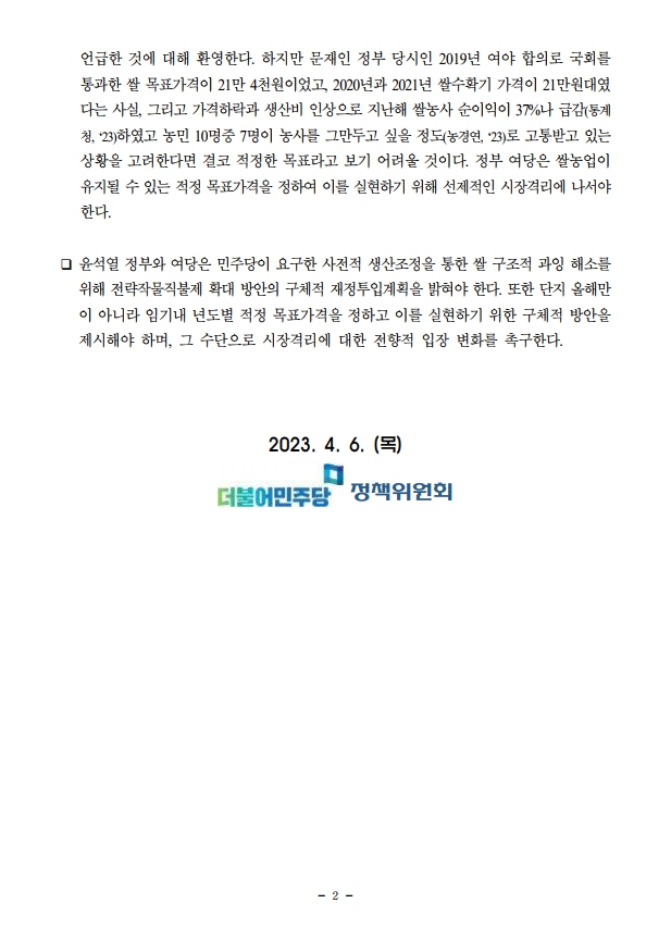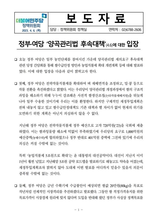 [보도자료] 더불어민주당 정책위원회, 정부·여당 ‘양곡관리법 후속대책’(4.6)에 대한 입장