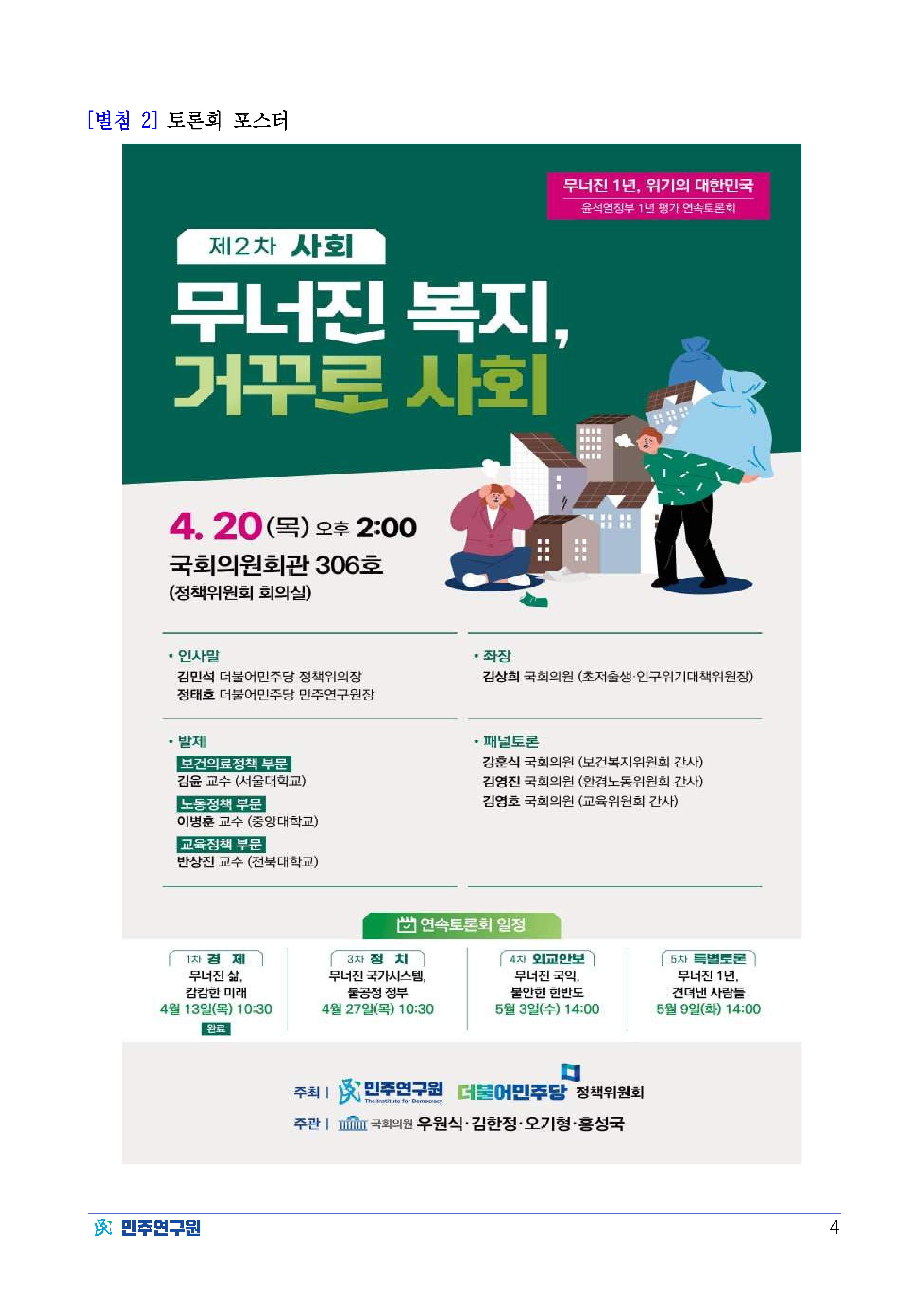 [보도자료] 더불어민주당 민주연구원, 윤석열정부 1년 평가 사회분야 토론회 개최 '무너진 복지, 거꾸로 사회'