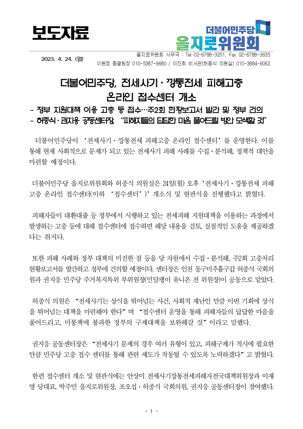 [보도자료] 더불어민주당 을지로위원회, '더불어민주당, 전세사기·깡통전세 피해고충 온라인 접수센터 개소'