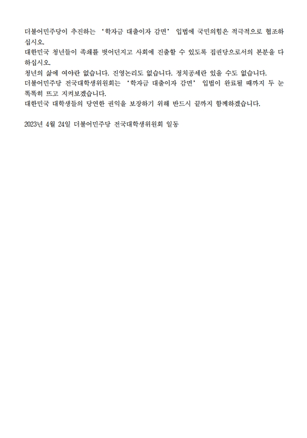 [보도자료] 더불어민주당 전국대학생위원회, “학자금 대출이자 감면 입법 즉각 완수하라”