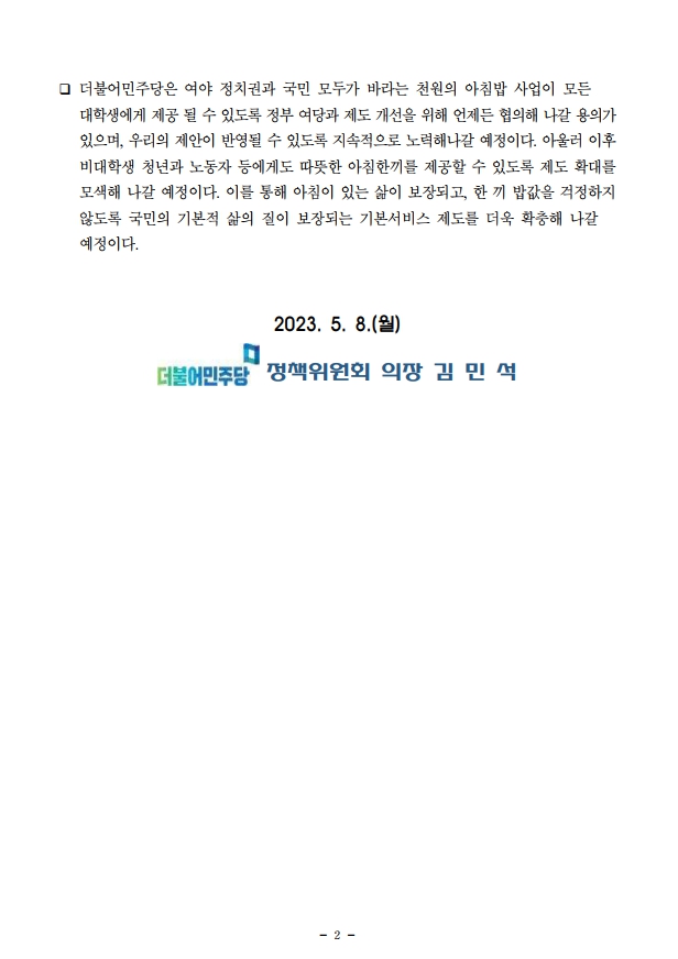 [보도자료] 더불어민주당 정책위원회, '천원 아침밥 확대' 정부 발표(5.8)에 대한 입장