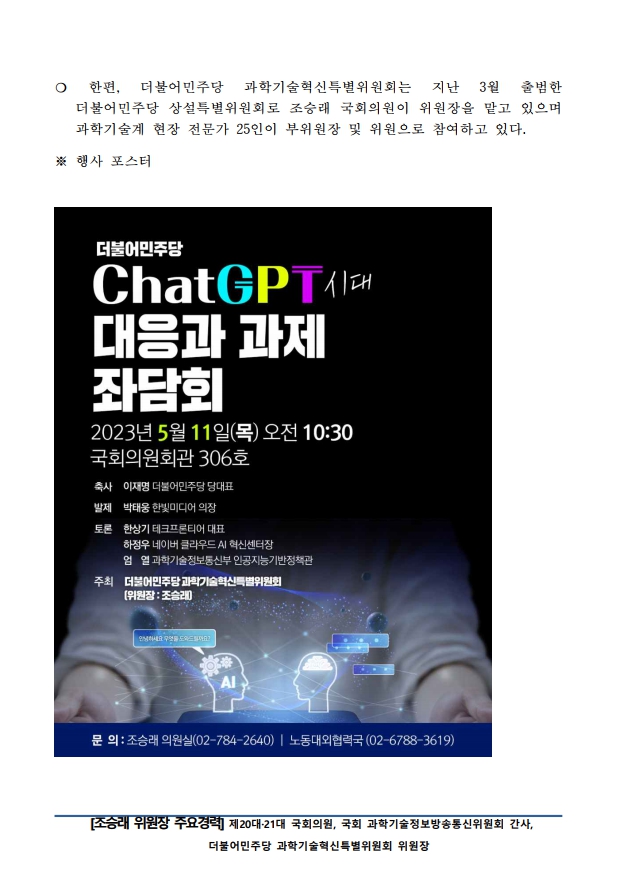 [보도자료] 더불어민주당 과학기술혁신특별위원회, ChatGPT시대 대응과 과제 좌담회 개최