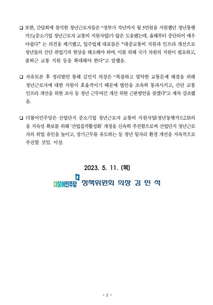 [보도자료] 더불어민주당 정책위원회, 산업단지 중소기업 청년교통비 법적 근거 마련 및 청년근로자 근무여건 개선에 최선을 다할 것