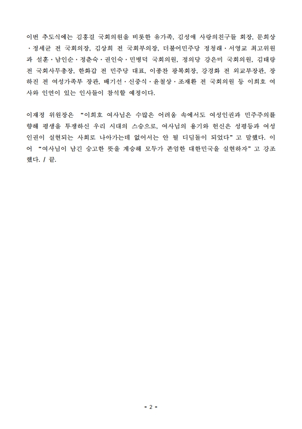 [보도자료] 더불어민주당 전국여성위원회, 여성운동가 이희호 여사 서거 4주기 추도식 개최