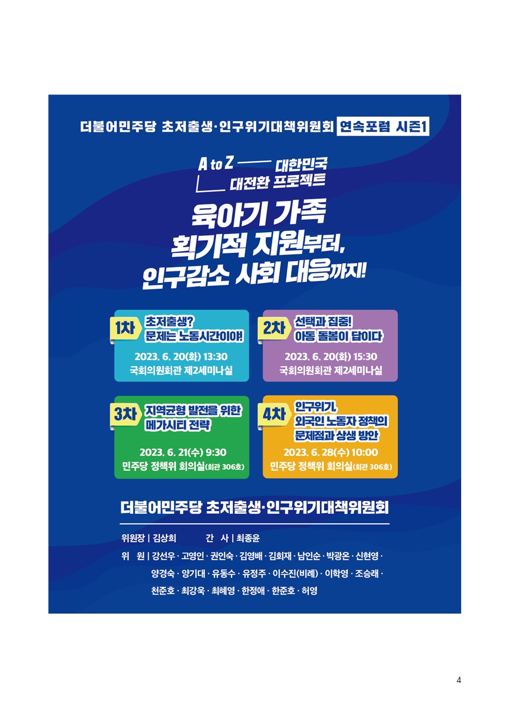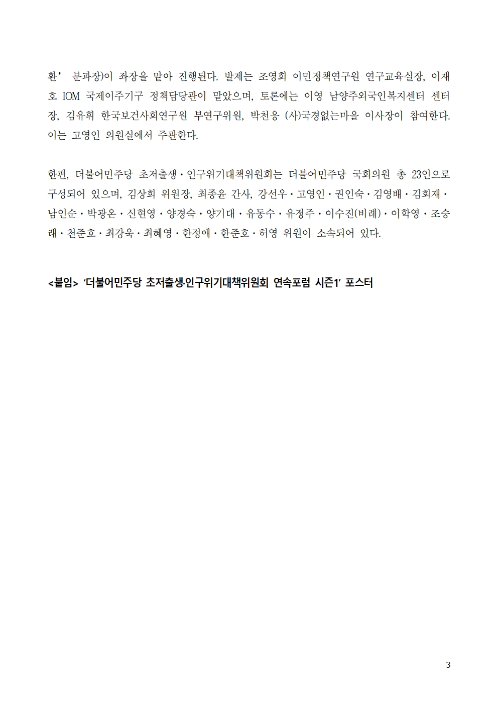 [보도자료] 더불어민주당 인구위기대책위, '육아기 가족 획기적 지원부터, 인구감소 사회 대응까지' 연속포럼 시즌1 개최