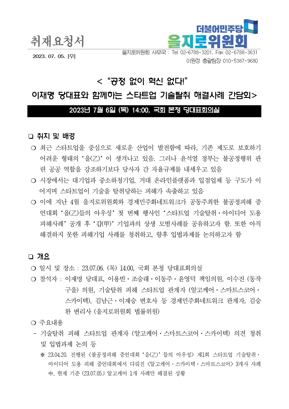 [취재요청서] 더불어민주당 을지로위원회, “공정 없이 혁신 없다!” 이재명 당대표와 함께하는 스타트업 기술탈취 해결사례 간담회