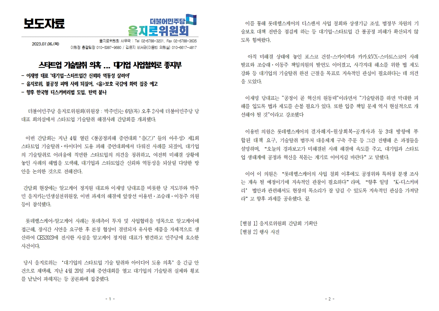 [보도자료] 더불어민주당 을지로위원회, 스타트업 기술탈취 의혹... 대기업 사업철회로 종지부
