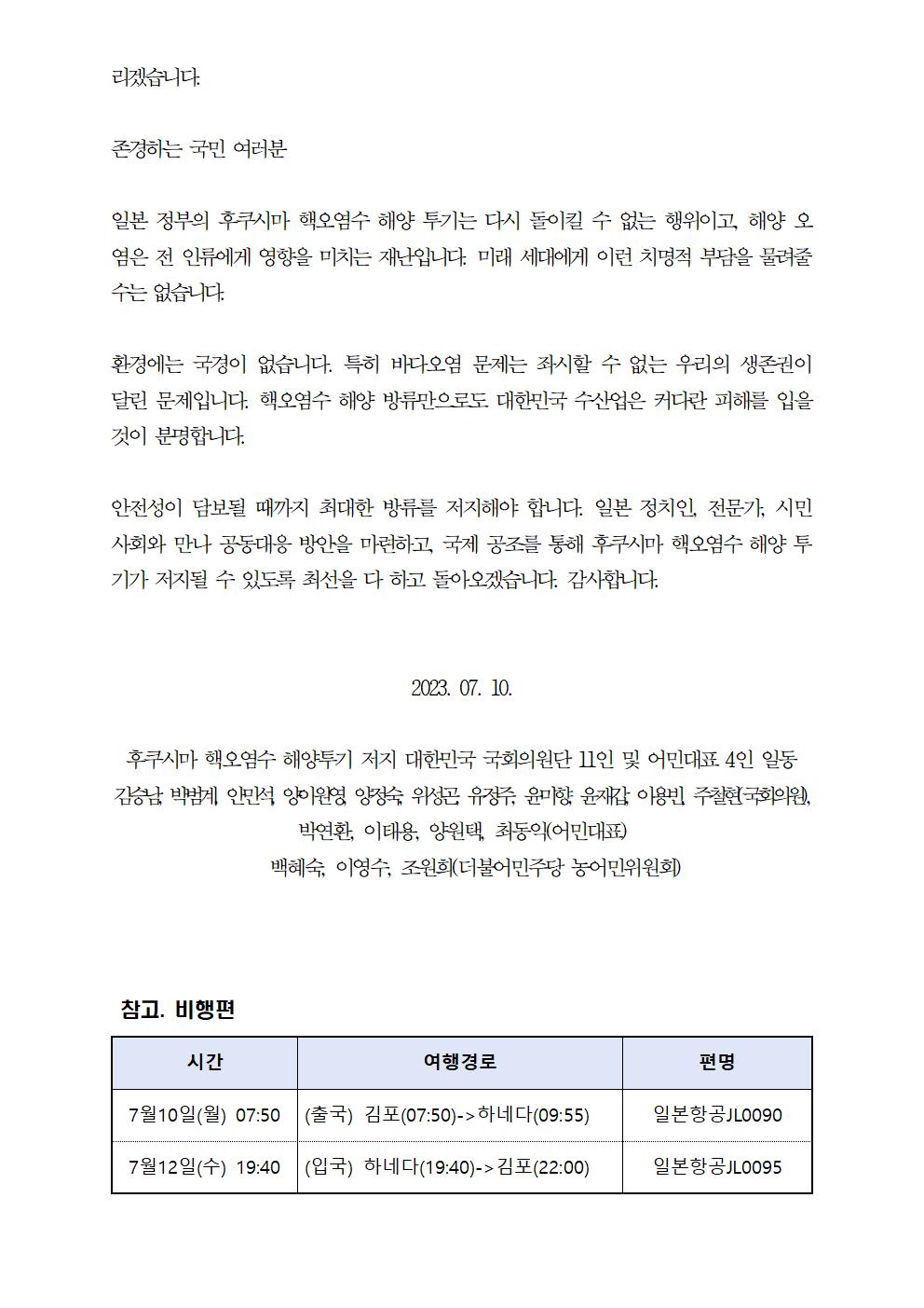 [보도자료]후쿠시마 핵오염수 해양투기 저지 대한민국 국회의원단 방일