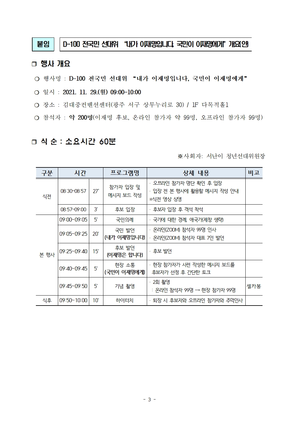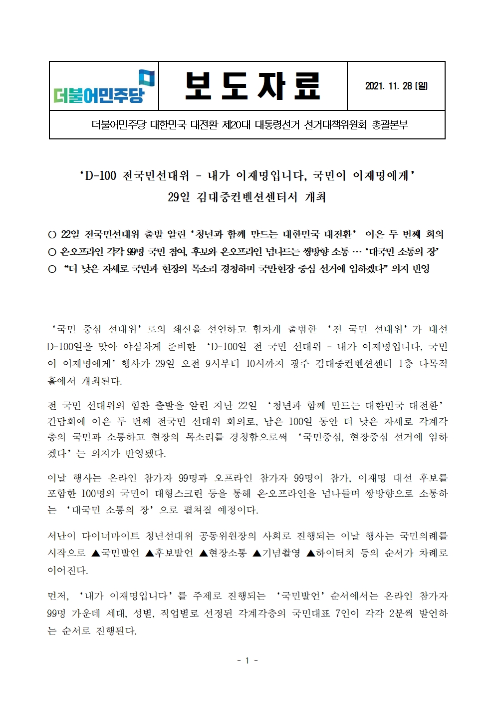 [보도자료] ‘D-100 전국민선대위' 29일 김대중컨벤션센터서 개최