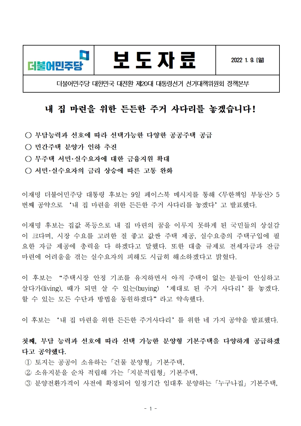 [보도자료] 더불어민주당 선대위 정책본부, '이재명의 무한책임 부동산 공약 5' 주거사다리 마련 공약