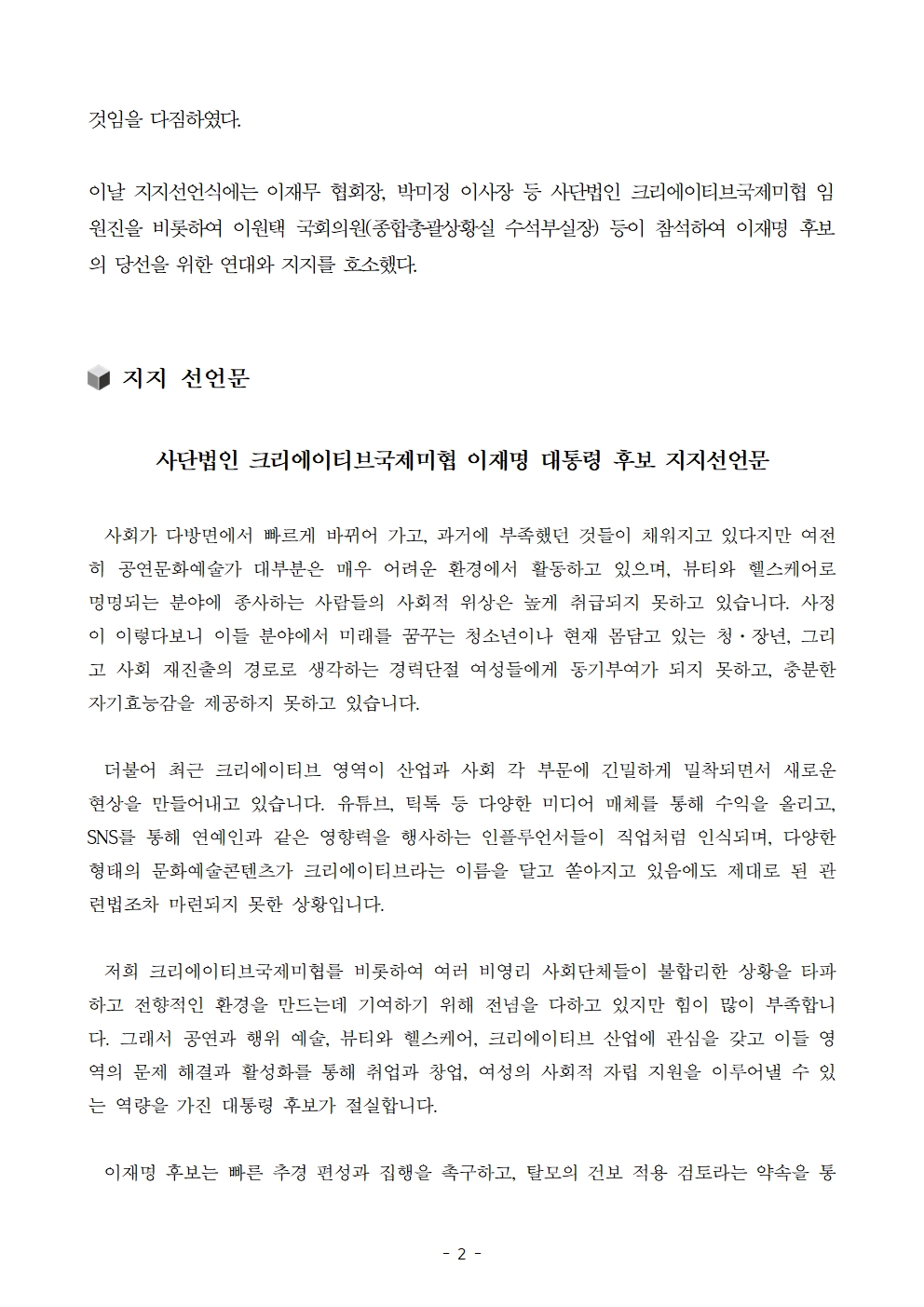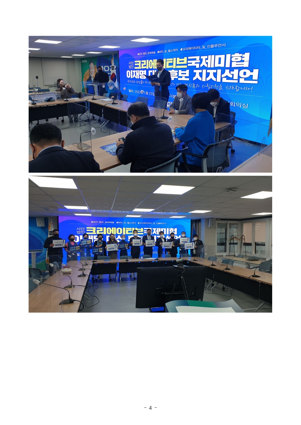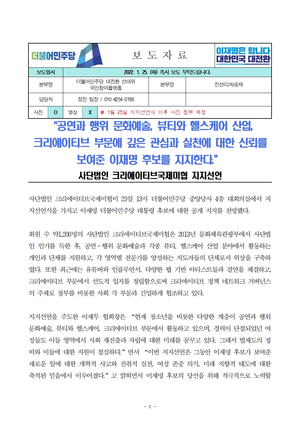 [보도자료] 더불어민주당 선대위 국민참여플랫폼, 사단법인 크리에이티브국제미협 지지선언
