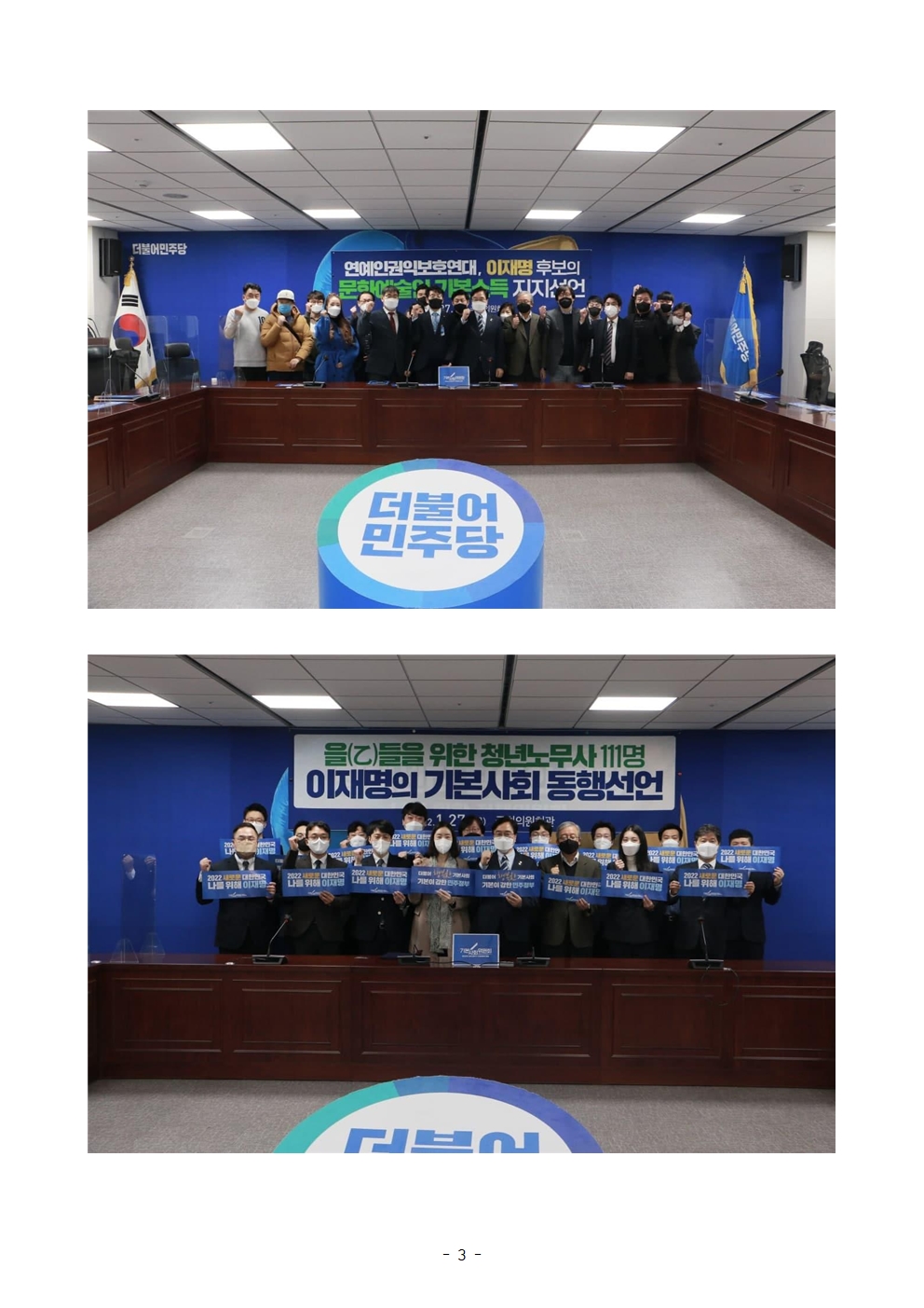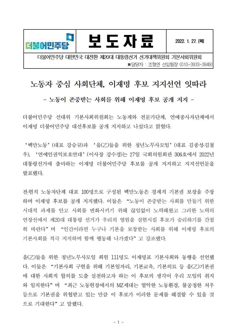 [보도자료] 더불어민주당 선대위 기본사회위원회, 노동자 중심 단체, 후보 지지선언