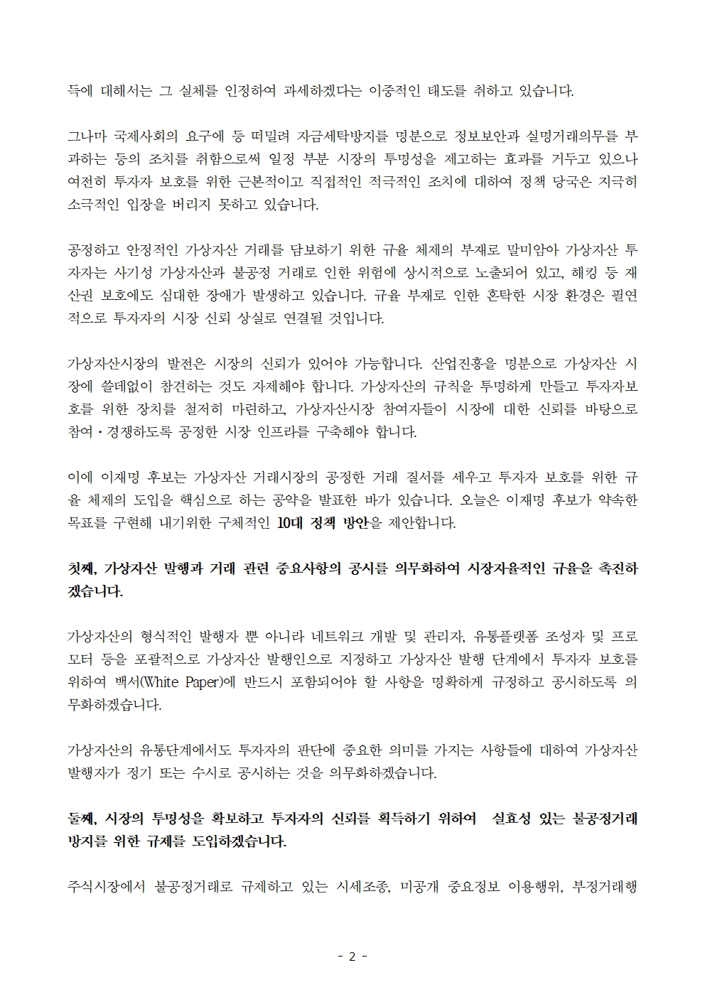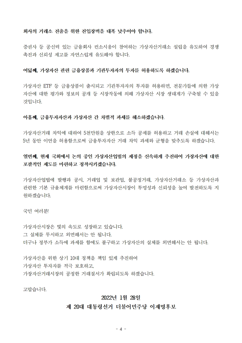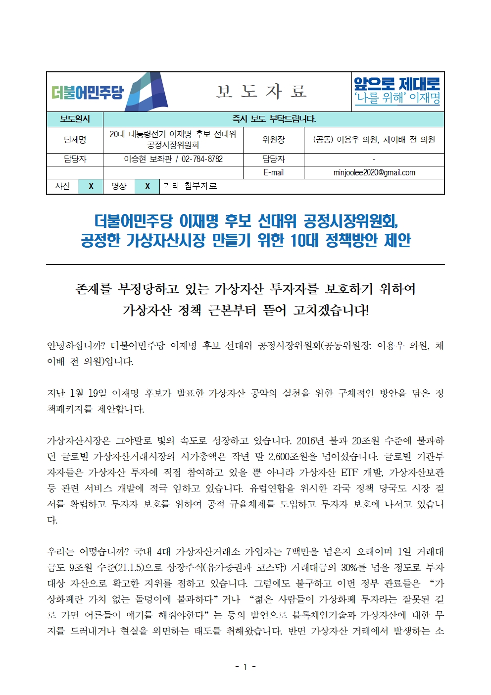 [보도자료] 더불어민주당 선대위 공정시장위원회, 공정한 가상자산시장 만들기 위한 10대 정책방안 제안