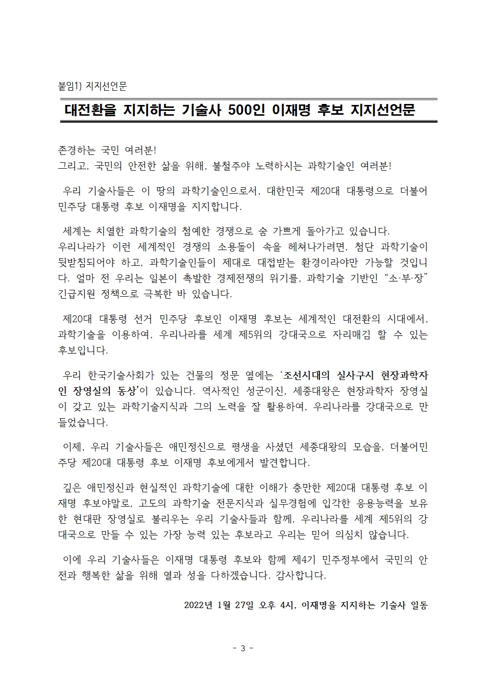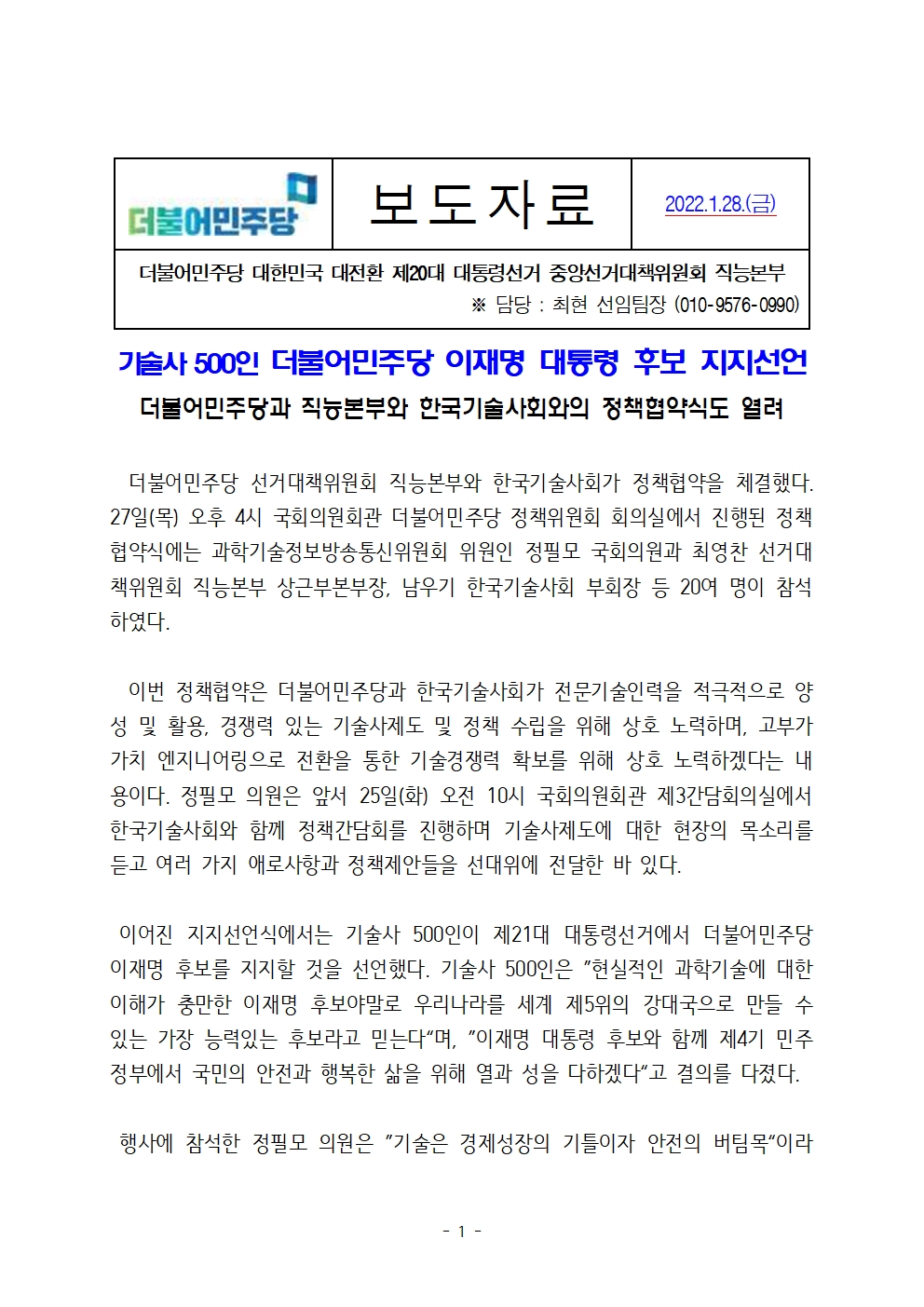 [보도자료] 더불어민주당 선대위 직능본부, 기술사 500인 지지선언 · 한국기술사회 정책협약 체결
