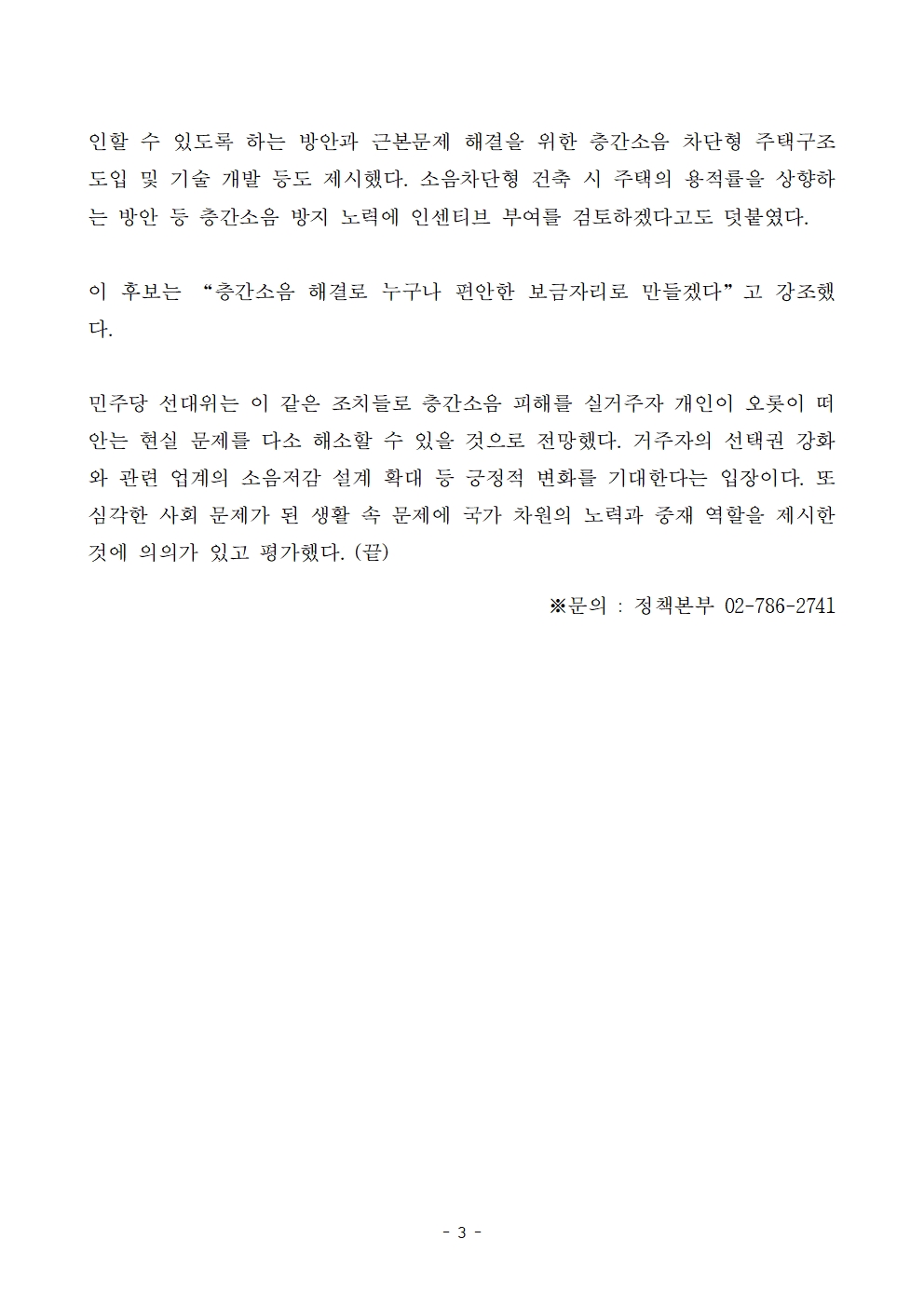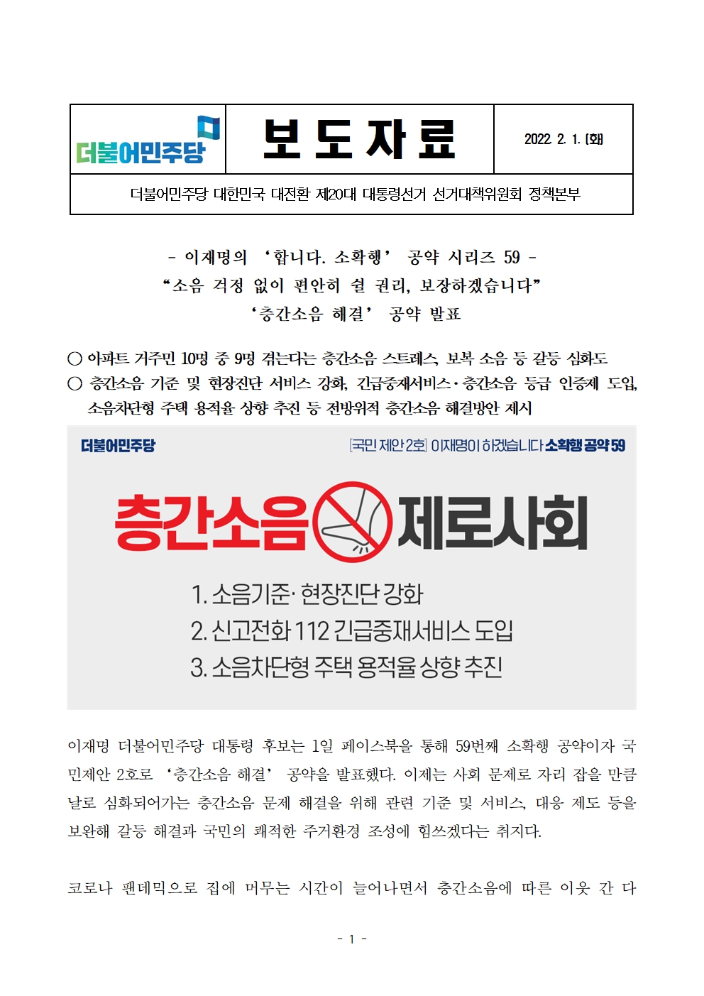 [보도자료] 더불어민주당 선대위 정책본부, '이재명은 합니다. 소확행 공약 시리즈 59' 층간소음 해결 공약 발표