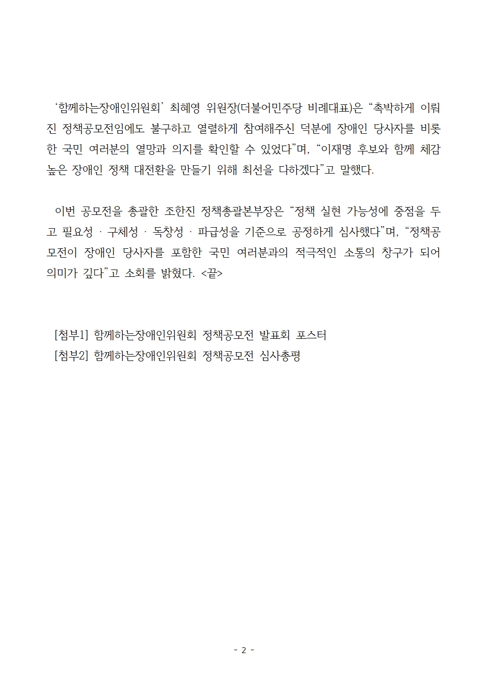 [보도자료] 더불어민주당 선대위 함께하는장애인위원회, 장애인정책 공모전 결과발표회 개최