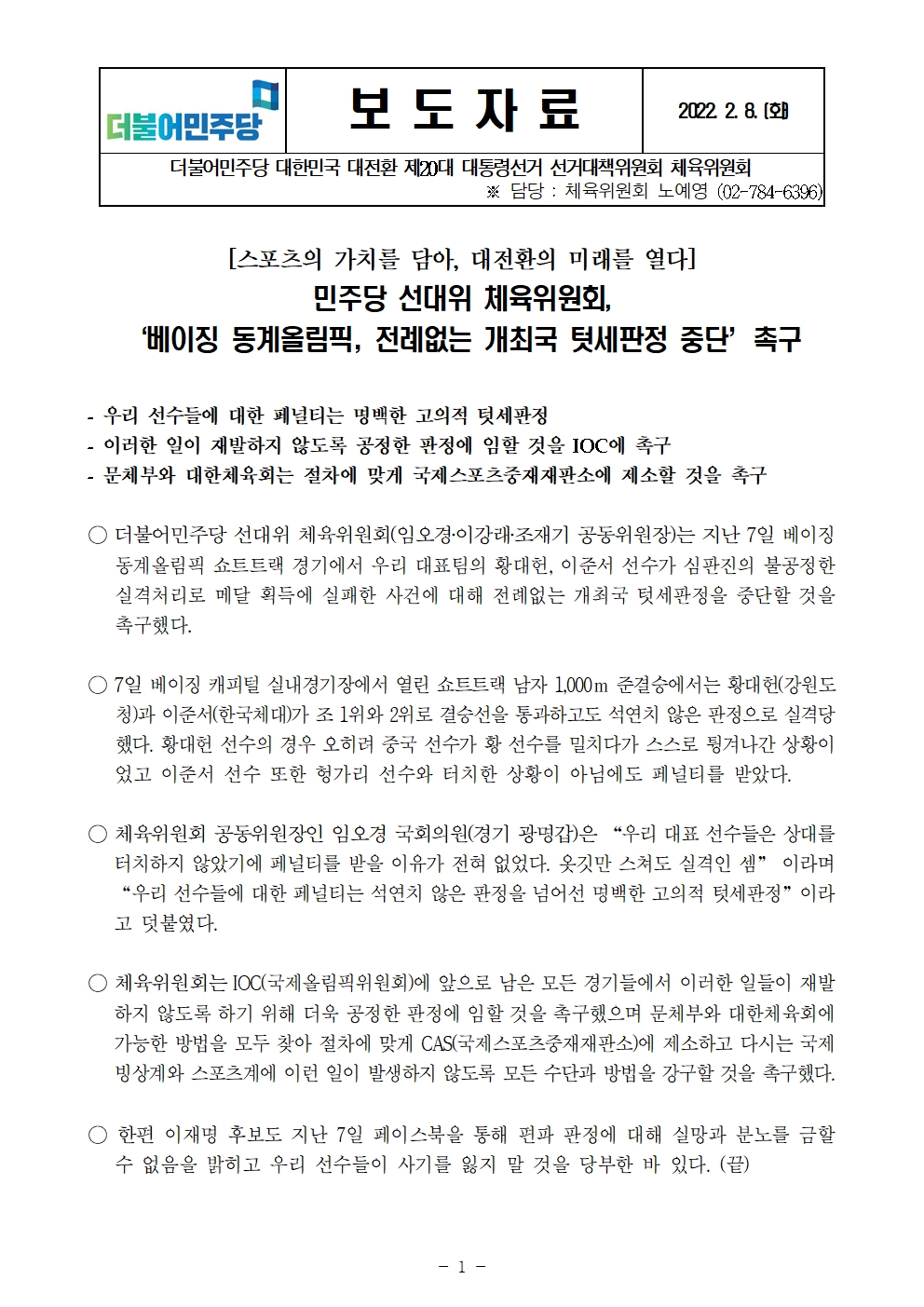 [보도자료] 더불어민주당 선대위 체육위원회, '베이징 동계올림픽, 전례없는 개최국 텃세판정 중단' 촉구
