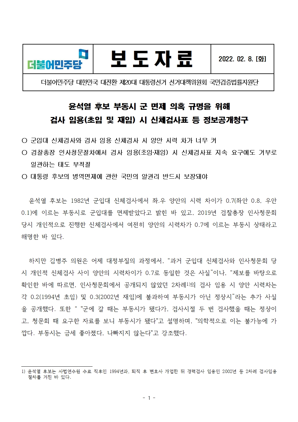 [보도자료] 더불어민주당 선대위 국민검증법률지원단, 윤석열 후보 부동시 군 면제 의혹 규명 위한 검사 임용 시 신체검사표 등 정보공개청구