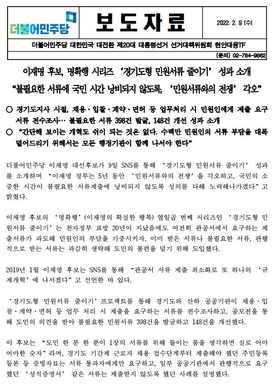 [보도자료] 더불어민주당 선대위 현안대응TF, 이재명 후보 '명확행' 열일곱 번째 시리즈 '경기도형 민원서류 줄이기' 성과 소개