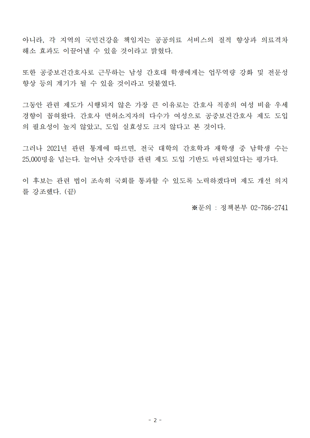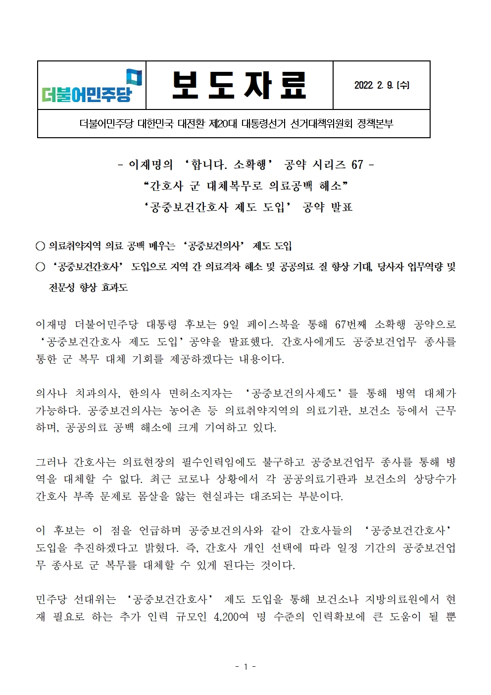 [보도자료] 더불어민주당 선대위 정책본부, '이재명은 합니다. 소확행 공약 시리즈 67' 공중보건간호사 제도 도입 공약 발표