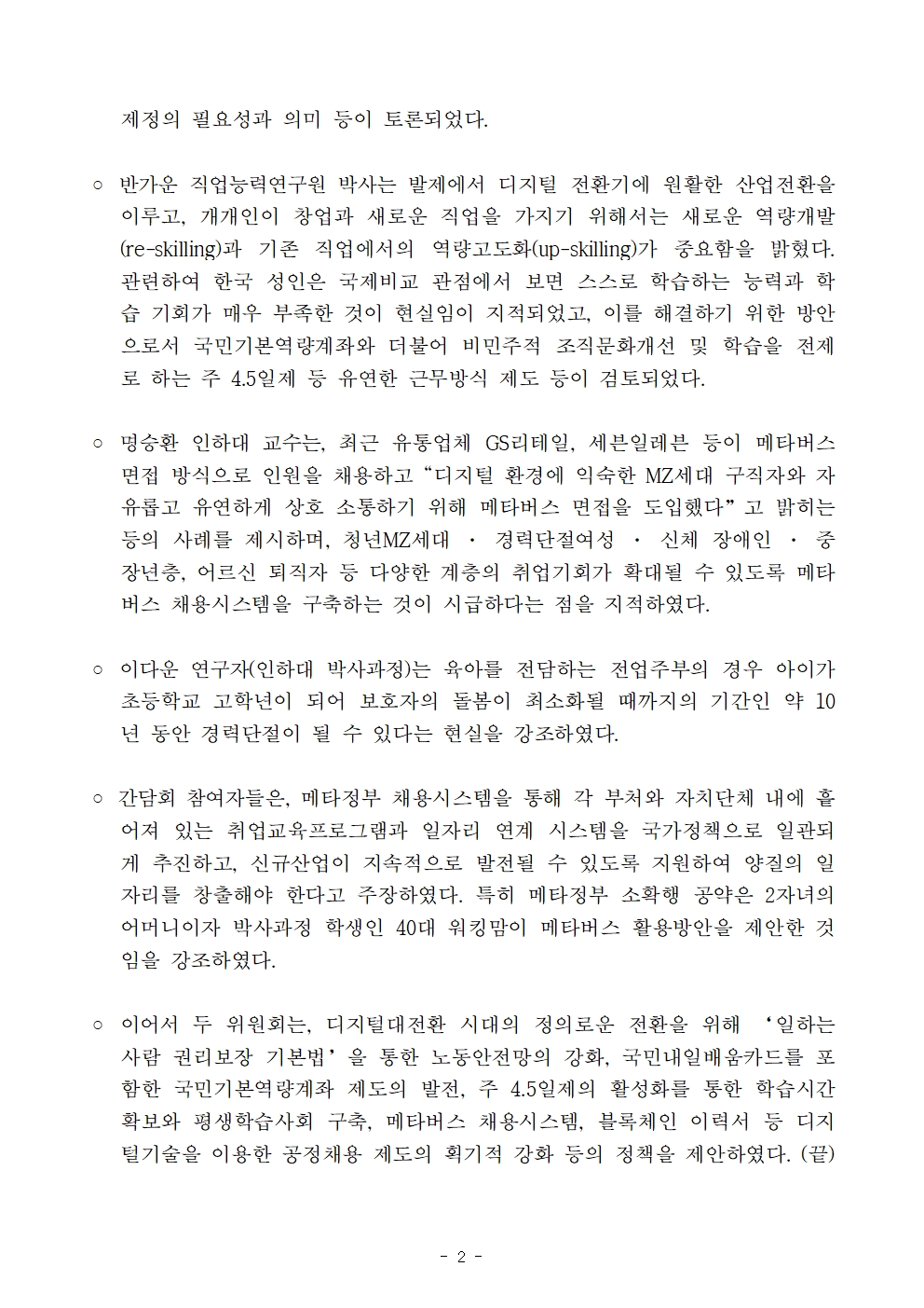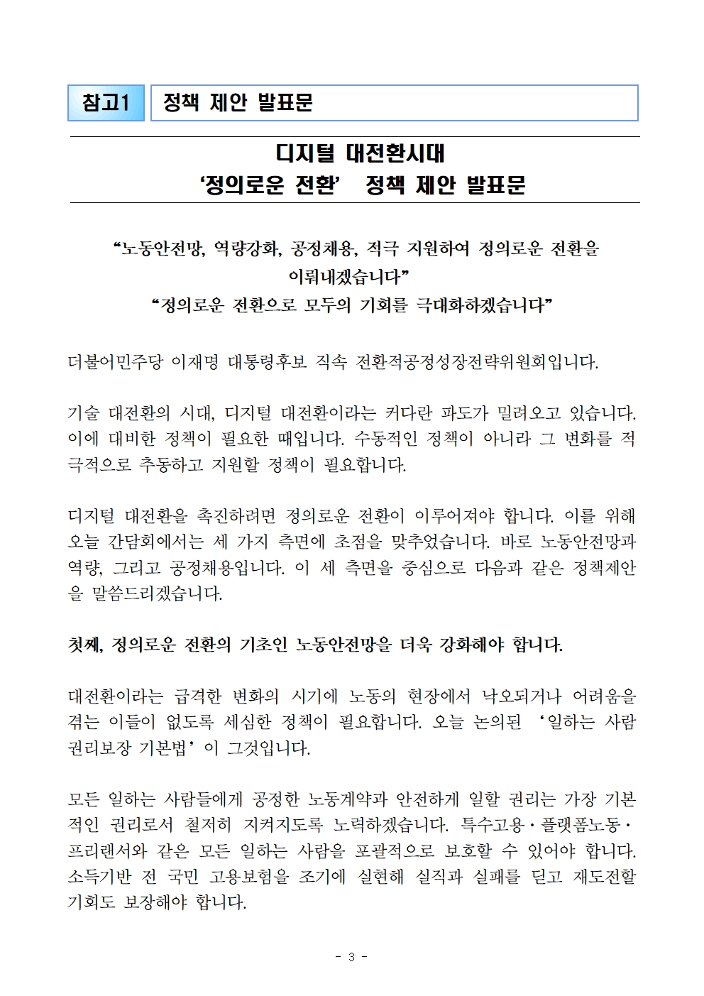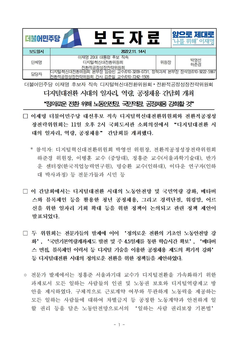 [보도자료] 더불어민주당 선대위 디지털·혁신대전환위원회 · 전환적공정성장전략위원회, '디지털대전환 시대의 일자리, 역량, 공정채용' 간담회 개최