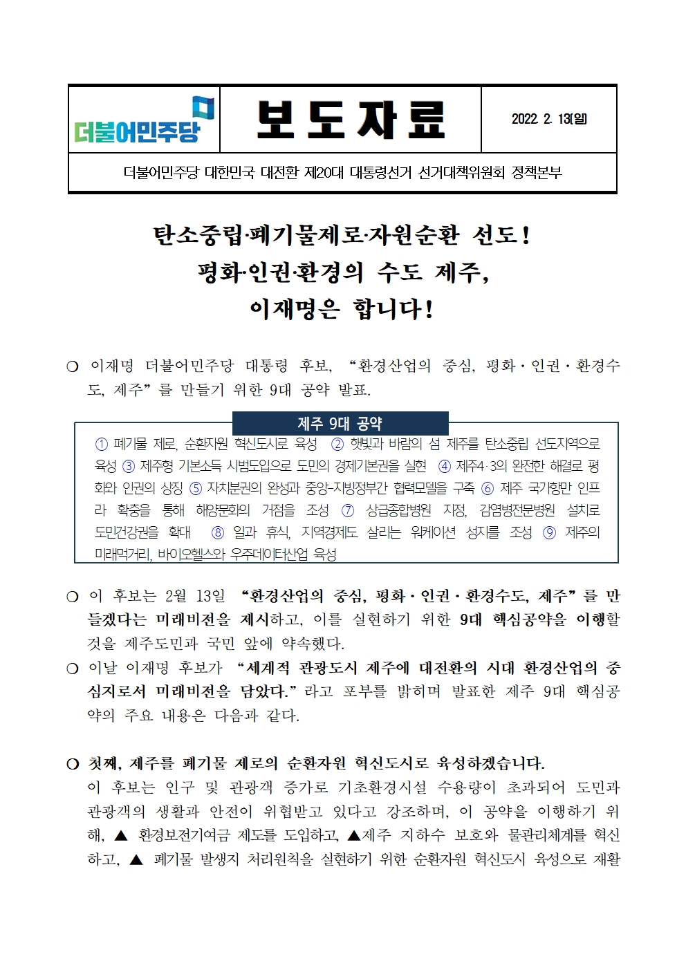 [보도자료] 더불어민주당 선대위 정책본부, 제주 9대 공약 발표