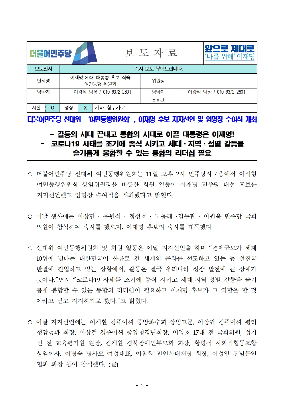 [보도자료] 더불어민주당 선대위 여민동행위원회, 후보 지지 선언 및 임명장 수여식 개최