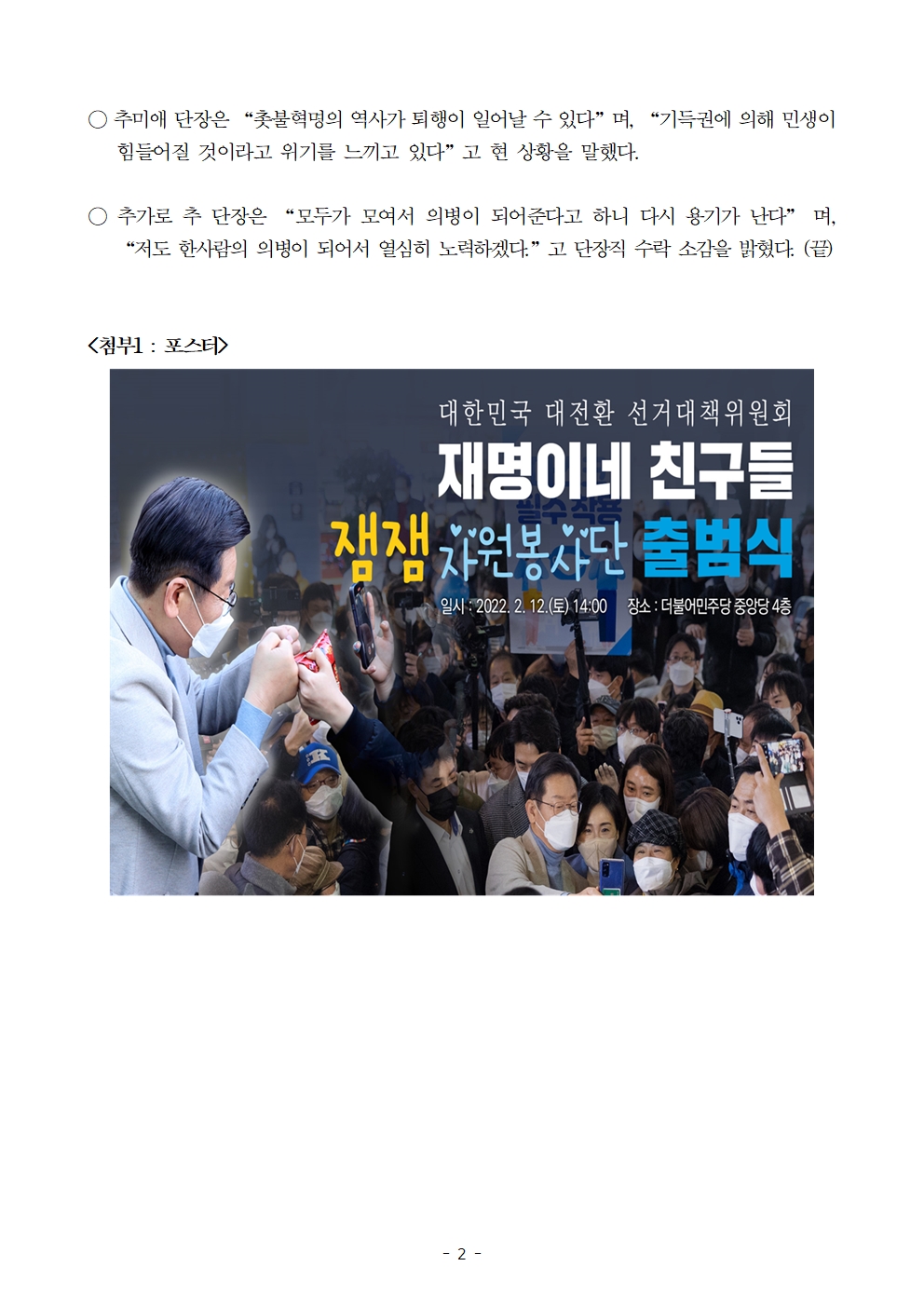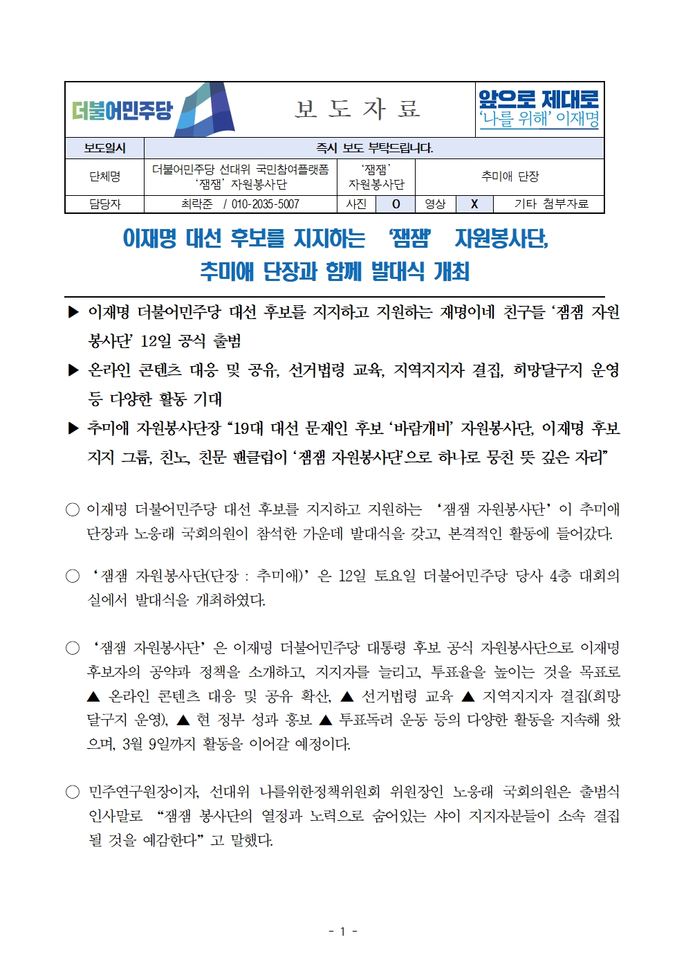 [보도자료] 더불어민주당 선대위 국민참여플랫폼, 잼잼 자원봉사단 발대식 개최