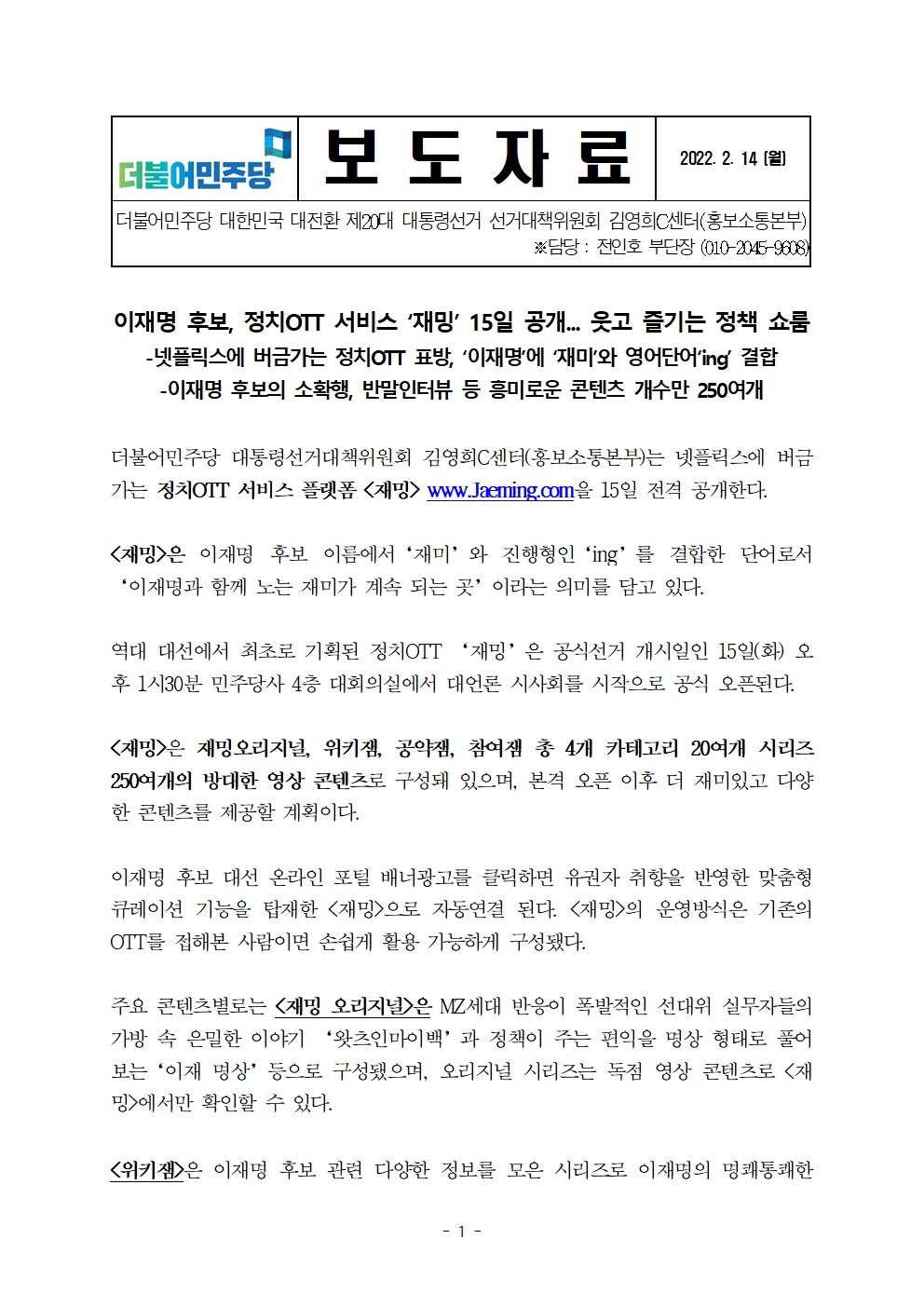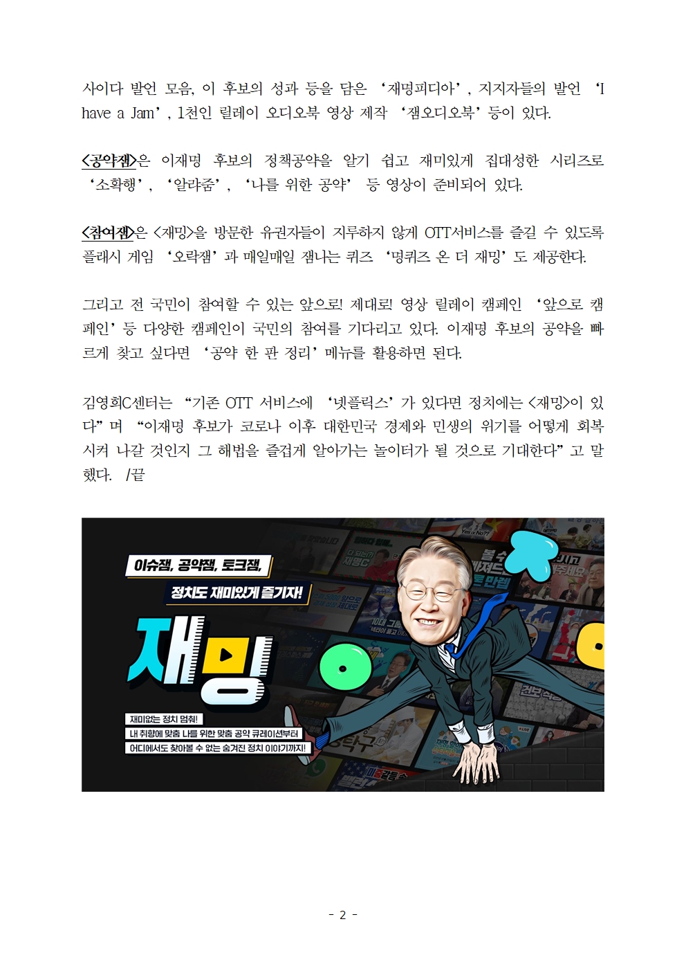 [보도자료] 더불어민주당 선대위 김영희C센터, 사상 첫 정치OTT 서비스 '재밍' 런칭
