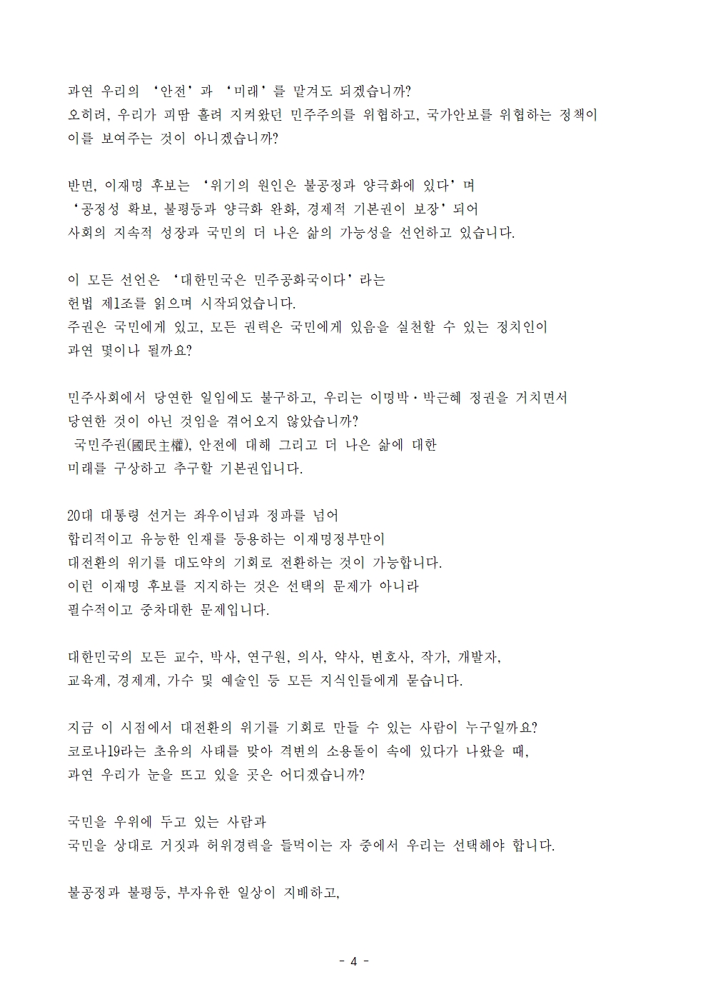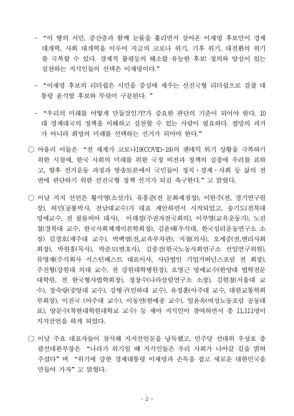 [보도자료] 더불어민주당 선대위 나를위한대한민국위원회·나를위한정책위원회, '대한민국을 깨우는 지식인' 1만 명 후보 지지 선언