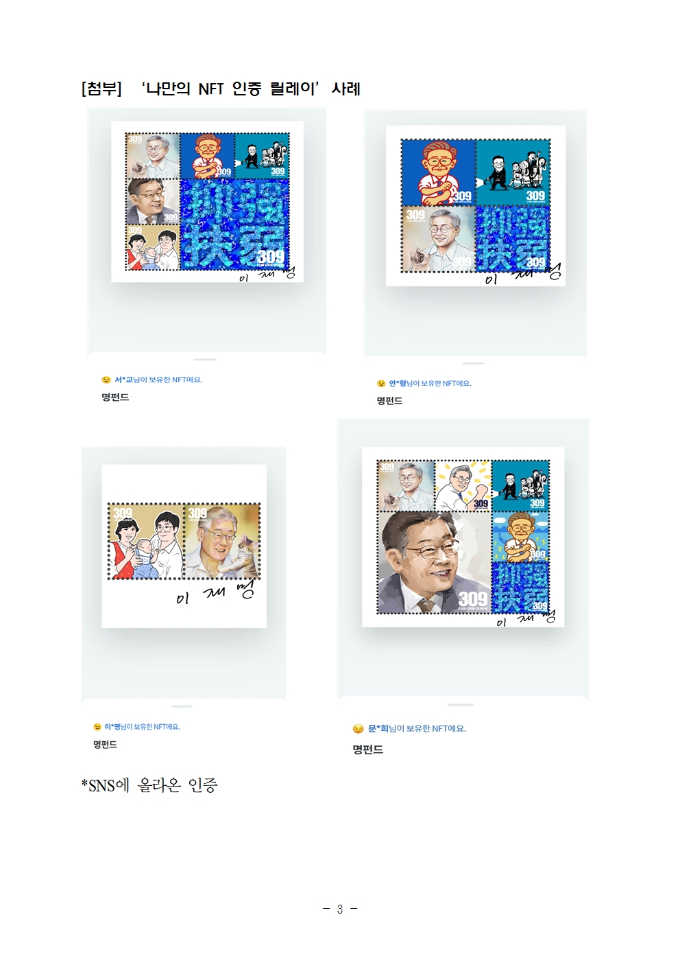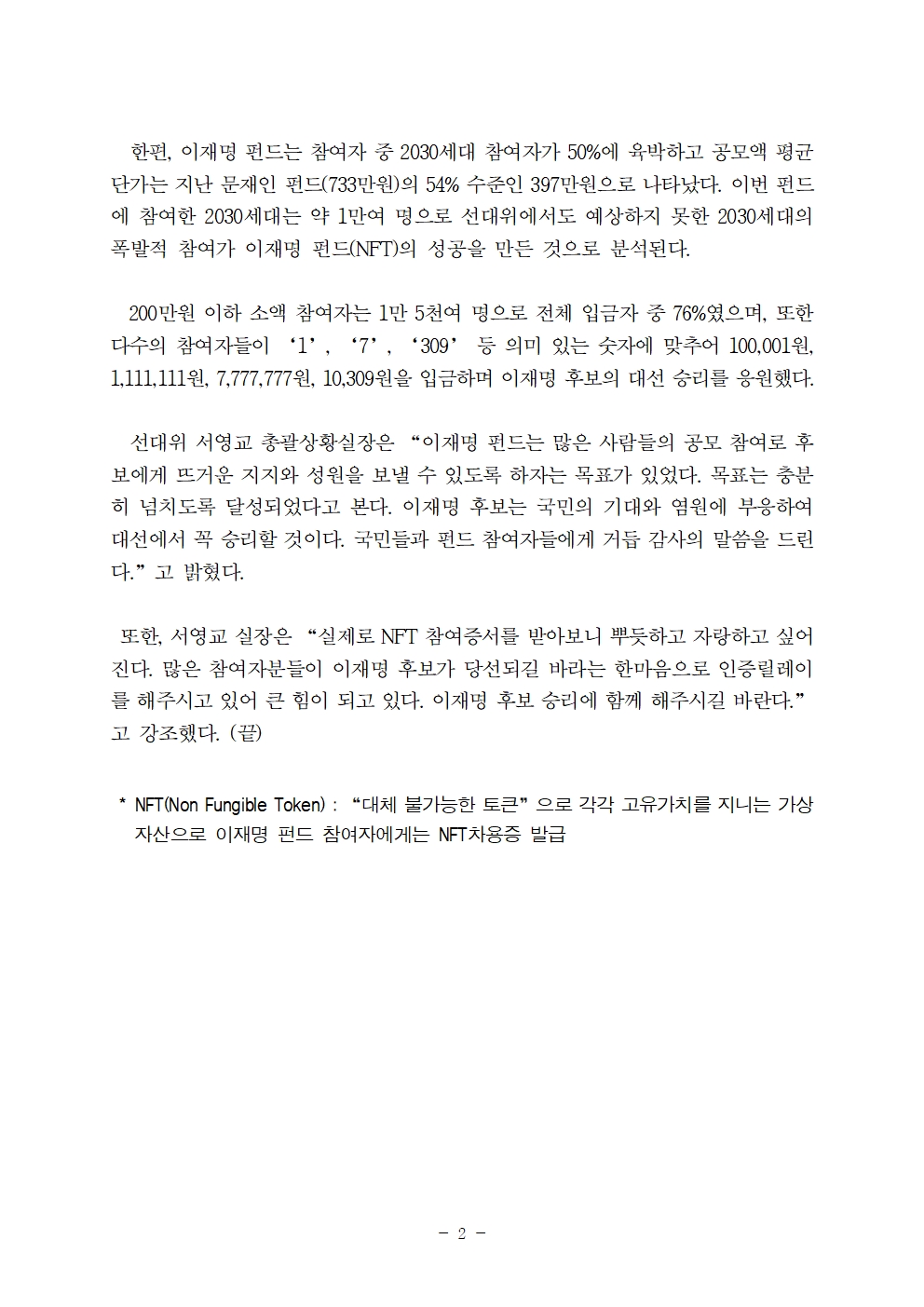 [보도자료] 더불어민주당 선대위 종합상황실, 이재명 펀드 '나만의 NFT 인증' 릴레이 화제