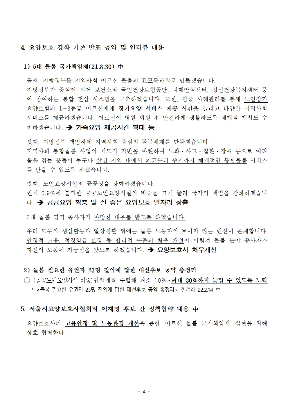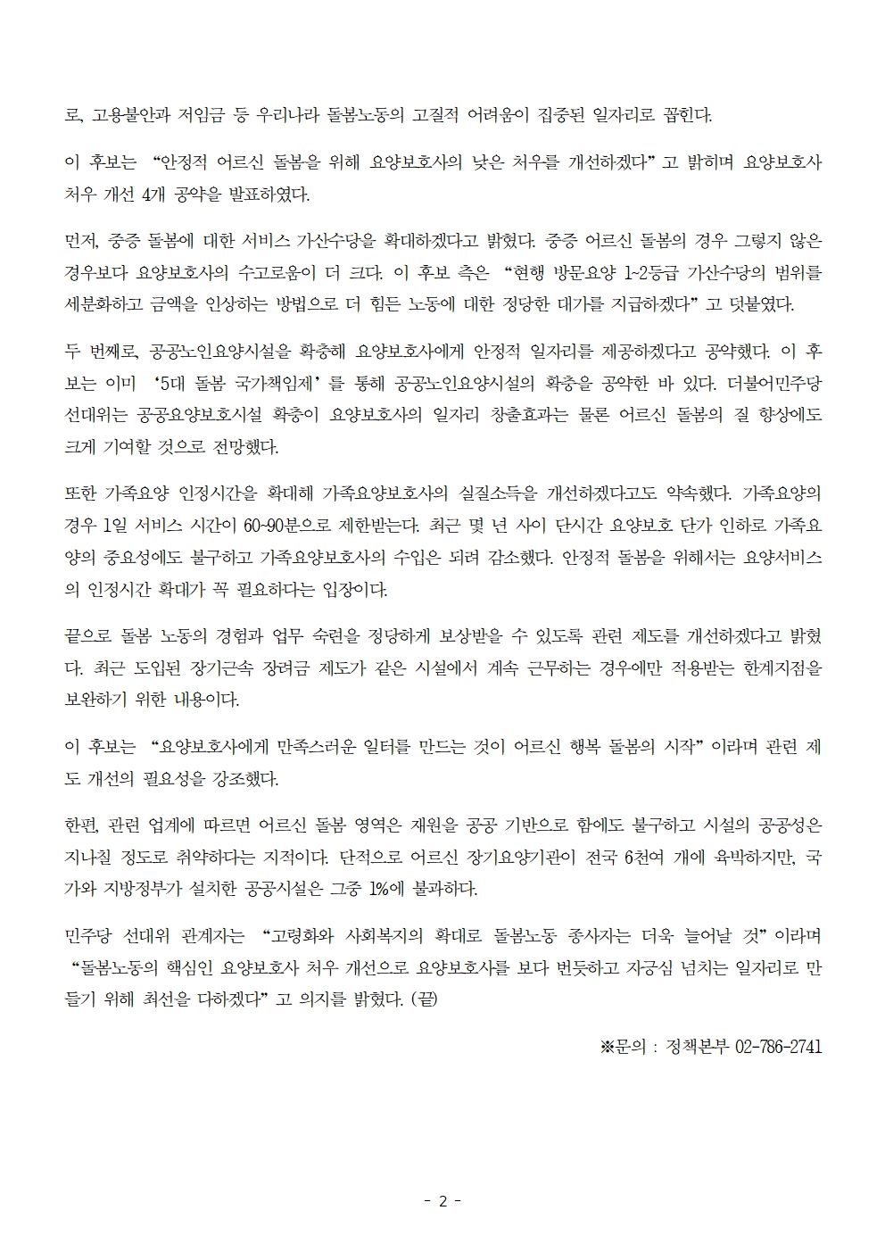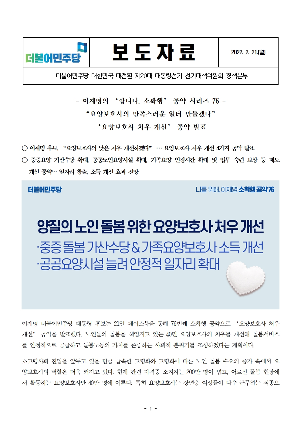 [보도자료] 더불어민주당 선대위 정책본부, '이재명은 합니다. 소확행 공약 시리즈 76' 요양보호사 처우 개선 공약 발표