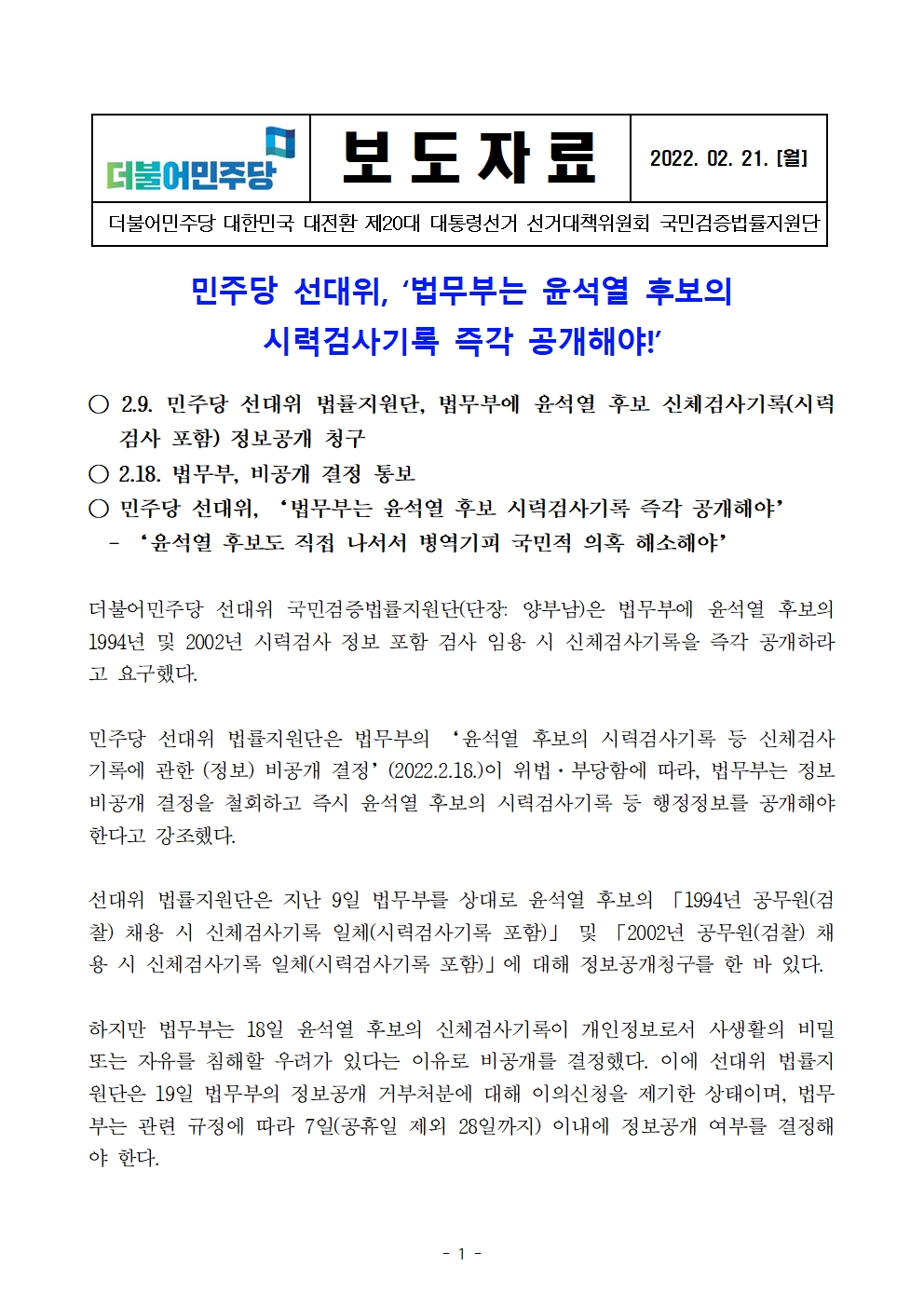 [보도자료] 더불어민주당 선대위 국민검증법률지원단, 법무부에 윤석열 후보 신체검사기록(시력검사 포함) 정보공개 청구