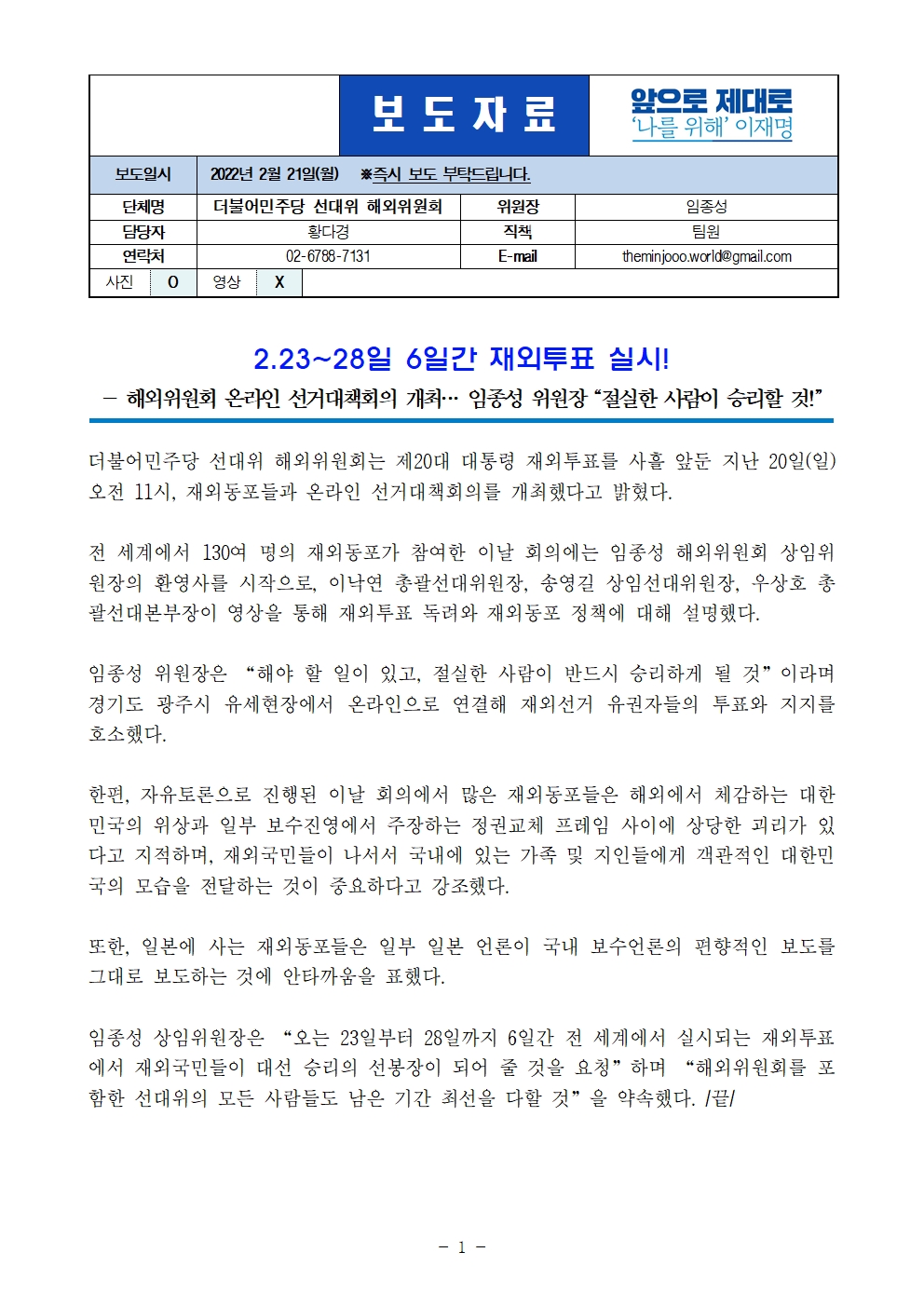 [보도자료] 더불어민주당 선대위 해외위원회, 2.23~28일 6일간 재외투표 실시, 투표 독려