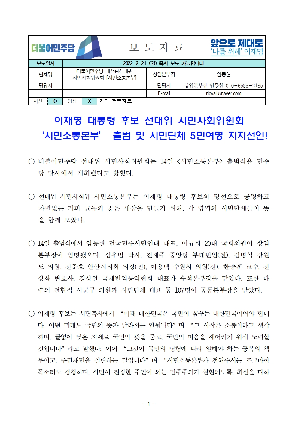[보도자료] 더불어민주당 선대위 시민사회위원회, '시민소통본부' 출범 및 시민단체 5만여 명 지지선언