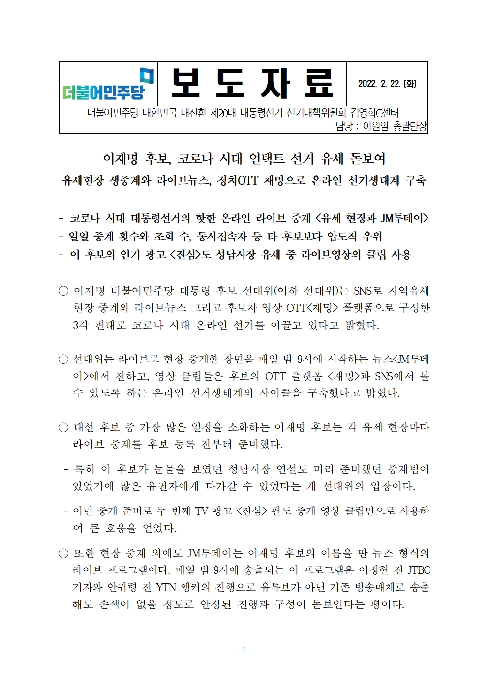 [보도자료] 더불어민주당 선대위 김영희C센터(홍보소통본부), 온라인 선거생태계 구축으로 언택트 선거 유세 돋보여