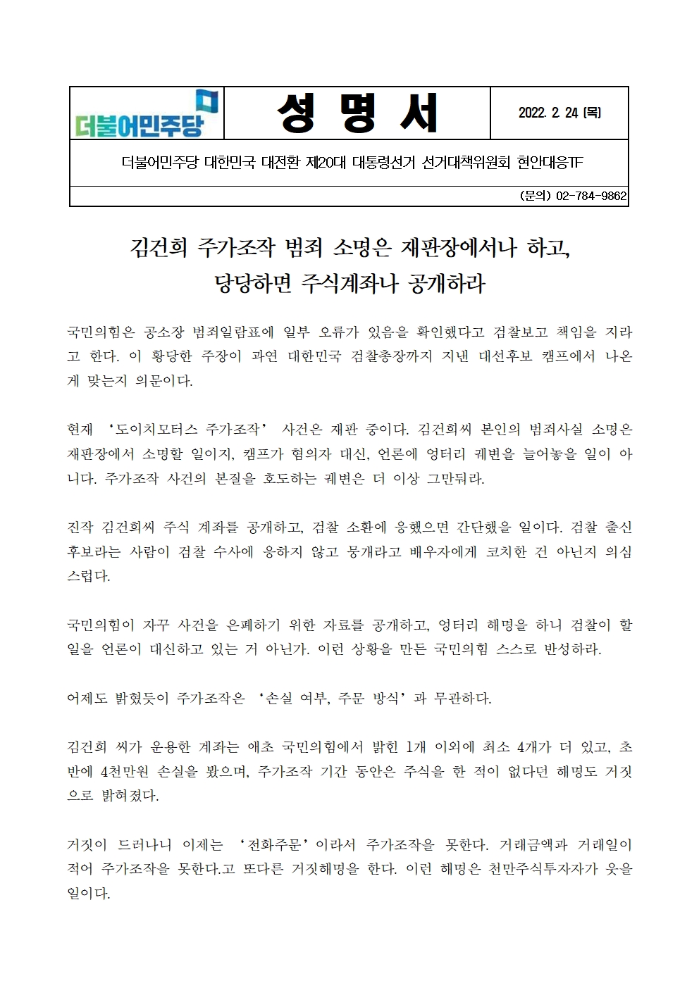 220224_현안대응_TF_김건희_주가조작_범죄소명은_재판장에서나_당당하면_주식계좌_공개하라_성명서.pdf