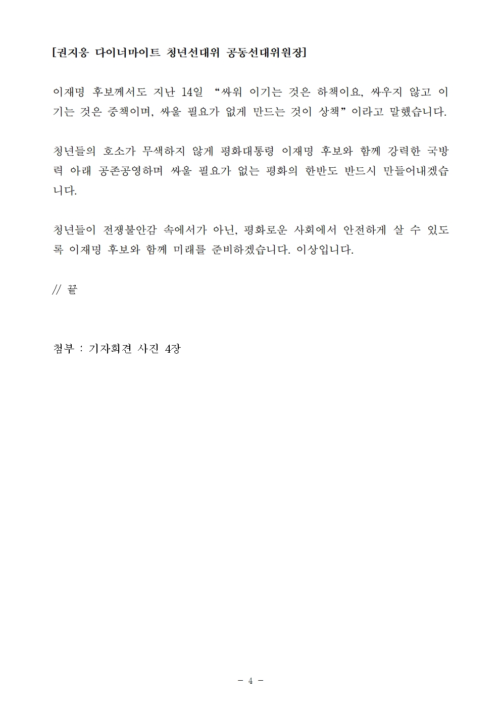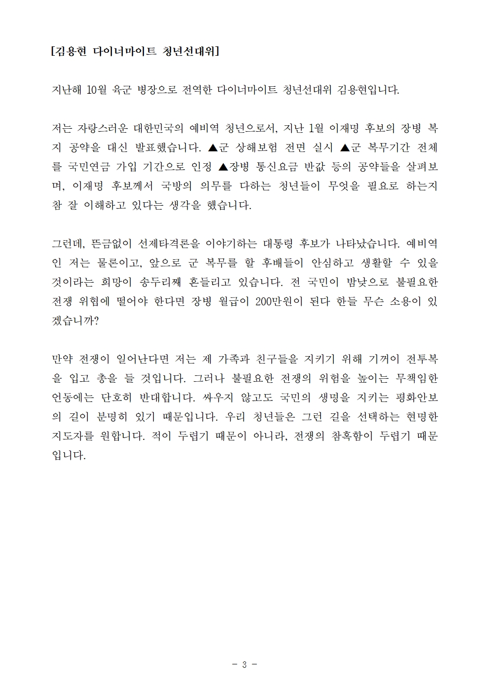 [기자회견문] 다이너마이트 청년선대위, 청년들은 전쟁 불안에 시달리고 싶지 않습니다