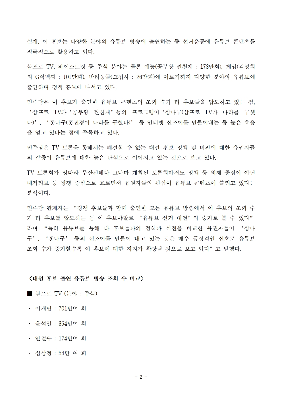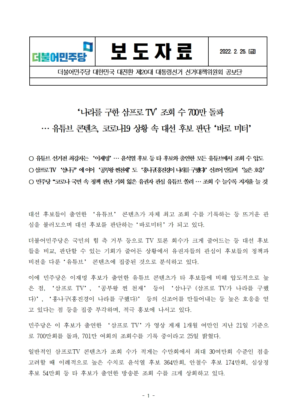 [보도자료] 더불어민주당 선대위 공보단, '나라를 구한 삼프로TV' 조회 수 700만 돌파