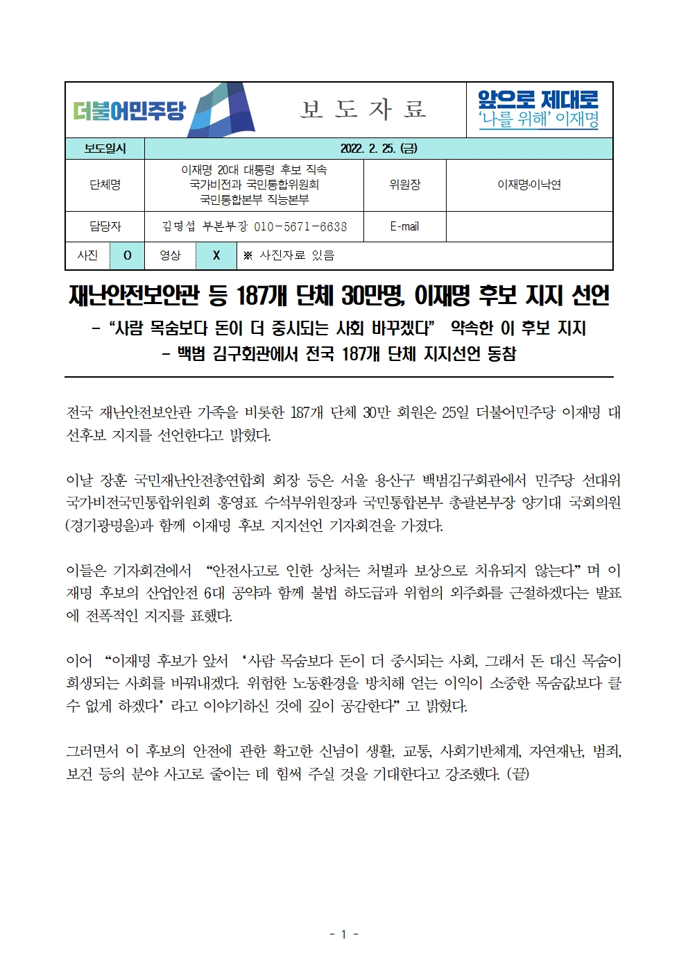 [보도자료] 더불어민주당 선대위 국가비전과 국민통합위원회, 재난안전보안관 등 187개 단체 30만명 후보 지지선언