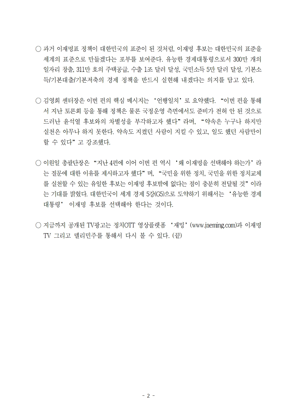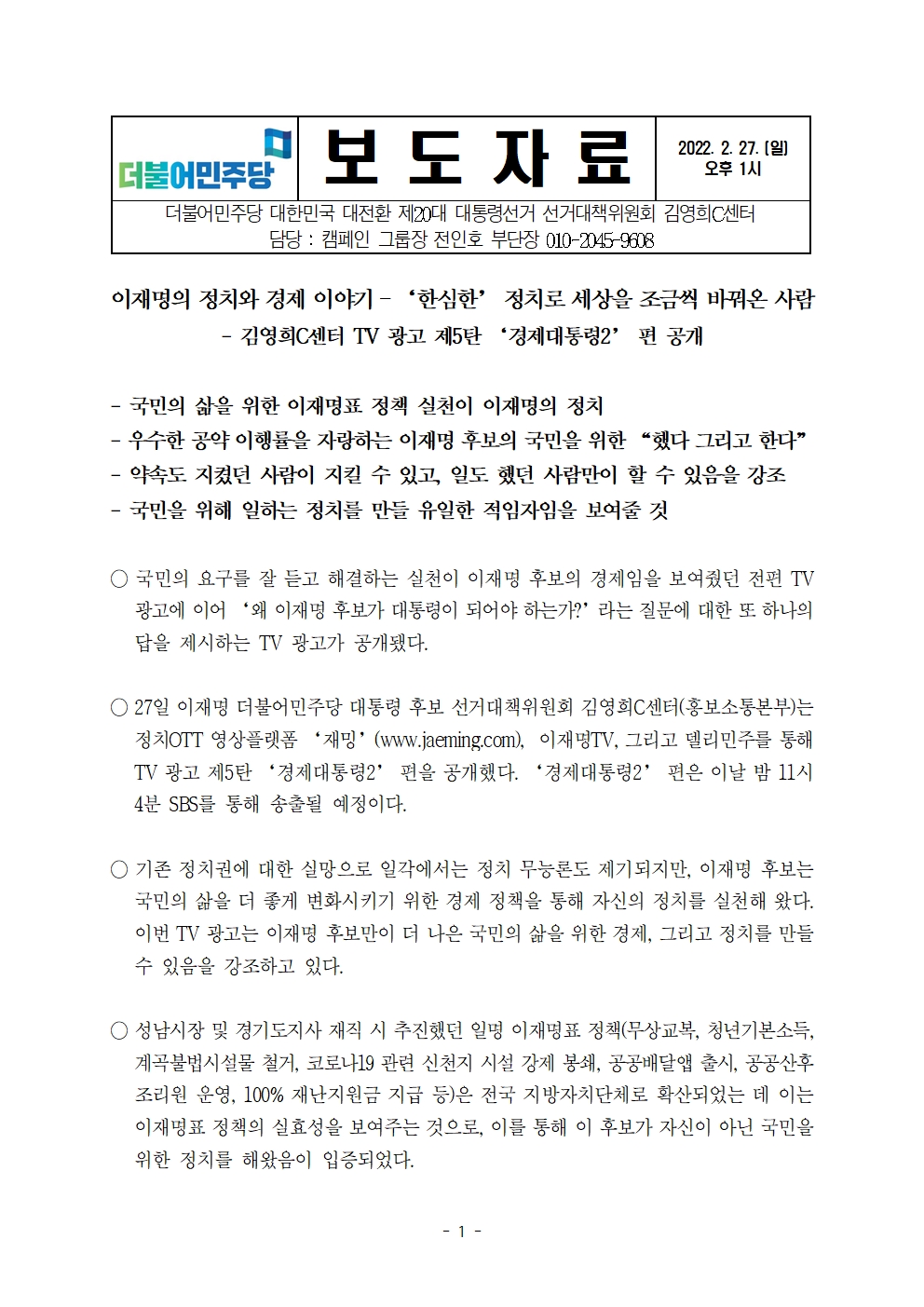 [보도자료] 더불어민주당 선대위 김영희C센터, TV광고 제5탄 '경제대통령2'편 공개